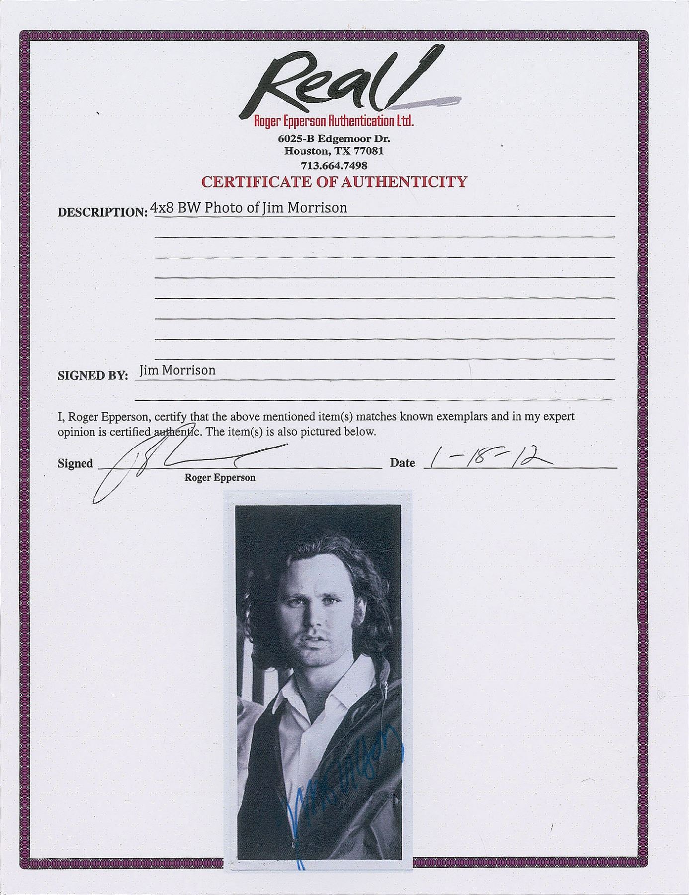 Extremely rare vintage glossy 4 x 8 photo of the influential Doors frontman staring directly into the camera, prominently signed in blue felt tip, "J. Morrison." In fine condition, with scattered light creasing and a light bend passing through the lower part of Morrison's neck and shirt collar. Accompanied by a full letter of authenticity from REAL. This iconic portrait was captured circa 1969 at Venice Pier by noted rock photographer Henry Diltz. The Doors came to be one of the most popular and successful American rock bands of all time, and Morrison one of rock's most legendary frontmen. Morrison remains highly elusive across all signed formats, with this striking example representing one of few signed photos we have ever offered. Elevated furthermore by its lack of an inscription, this is an immensely desirable and seldom-encountered signed image of the counterculture icon—a truly superlative piece.