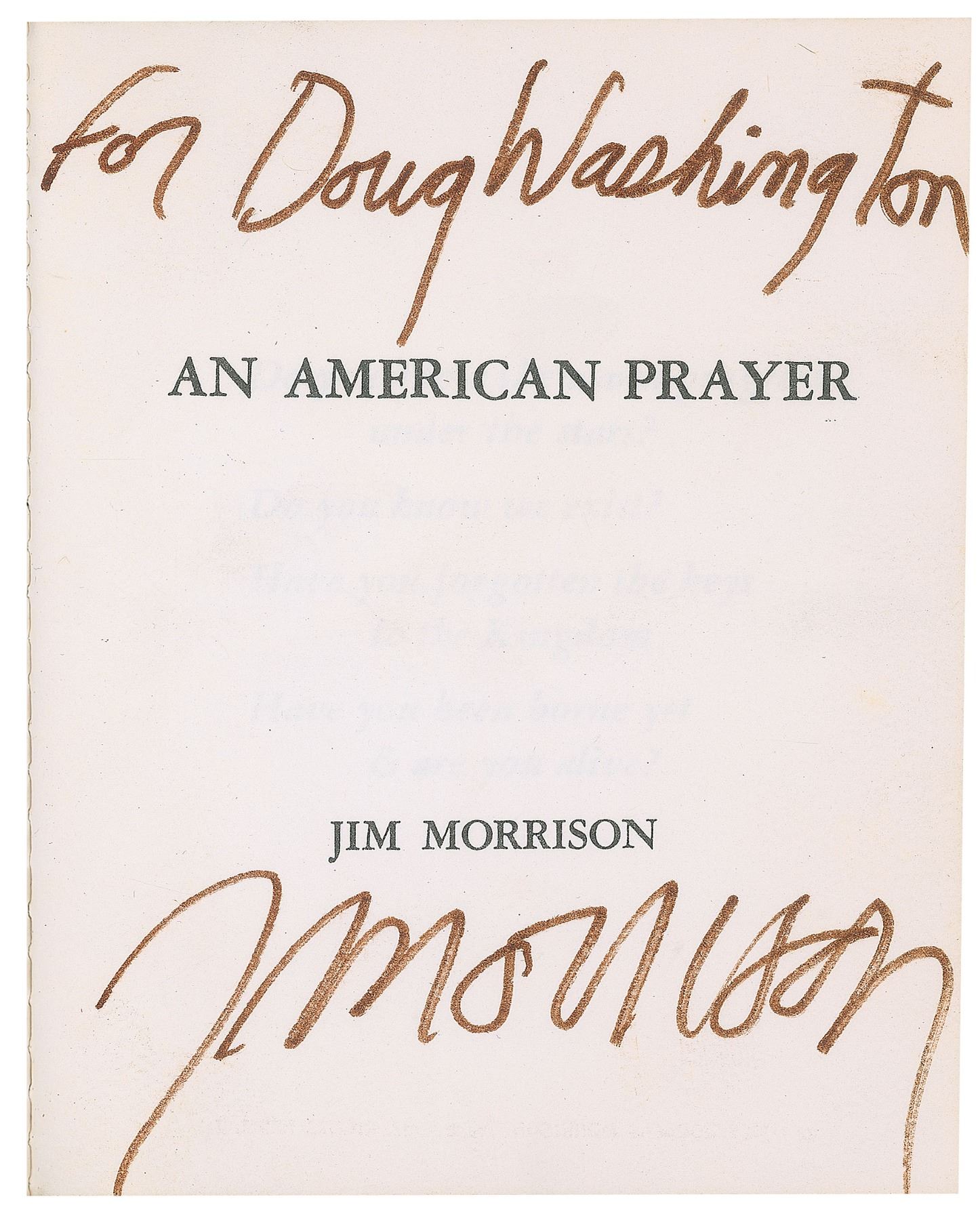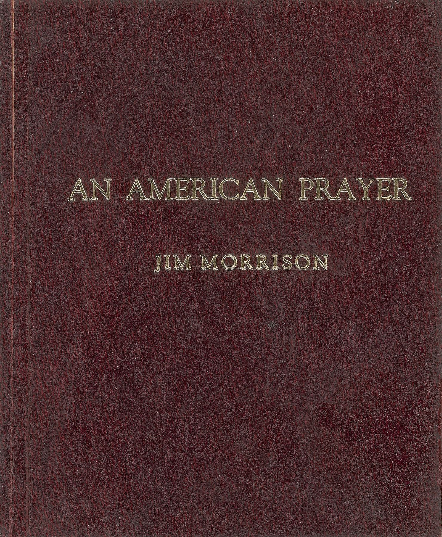 Rare signed book: An American Prayer. Privately published, 1970. Hardcover, 4 x 4.75, 40 pages. Signed and inscribed on the title page in brown felt tip, "For Doug Washington, J. Morrison." Autographic condition: very fine. Book condition: VG+/None. Maroon heavy cardstock covers with gilt lettering to front; minor wear to edges, with a light bump to front and rear lower edges; minimal soiling to exterior. Morrison took poetry quite seriously, publishing a few small volumes of verse during his lifetime and often improvising poetic passages on stage. With a limited printing of somewhere between 100 and 500 copies, this is a rarely found and extremely desirable book.