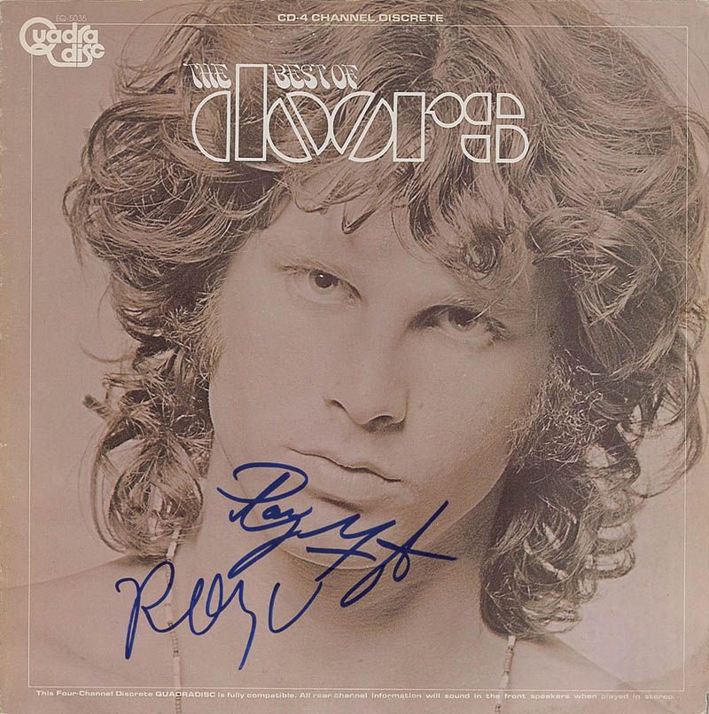 The Best of Doors album signed on the front cover in blue felt tip by Ray Manzarek and Robby Krieger. In fine condition, with a bit of scattered light cover wear. The record is not included.