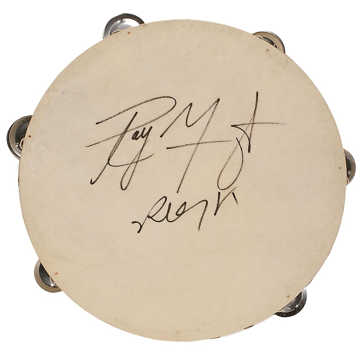 Off-white 10? tambourine, signed on the head in black felt tip by Ray Manzarek and Robby Krieger. In fine condition, with typical slight irregularities and discoloration to skin.