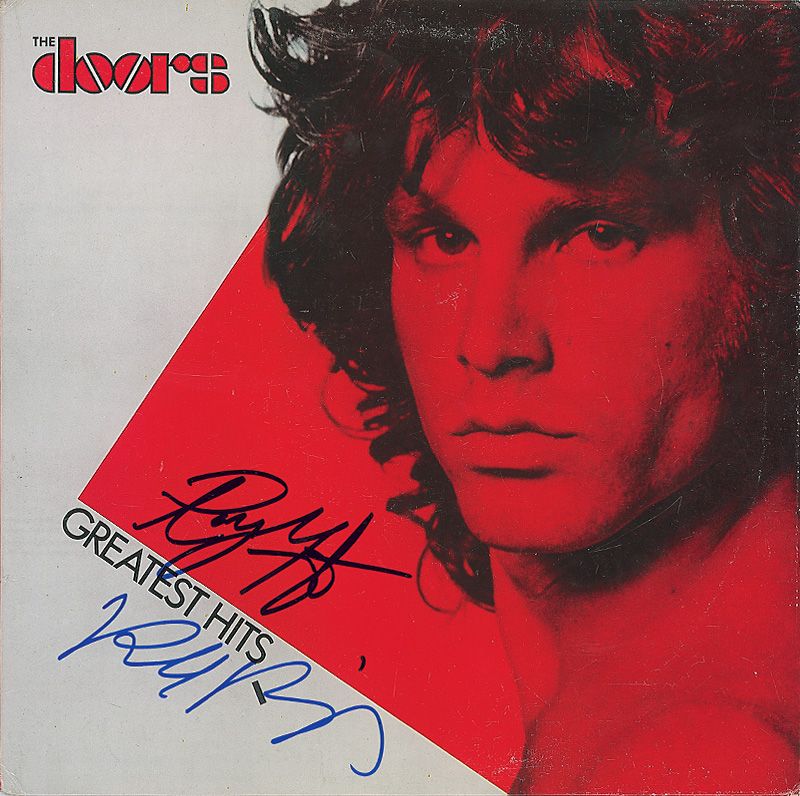 The Doors Greatest Hits album signed on the front in black felt tip by Ray Manzarek and in blue felt tip by Robby Krieger. In fine condition, with mild ‘ring of wear’ to covers and some light corner and edge creases. The record is not included.