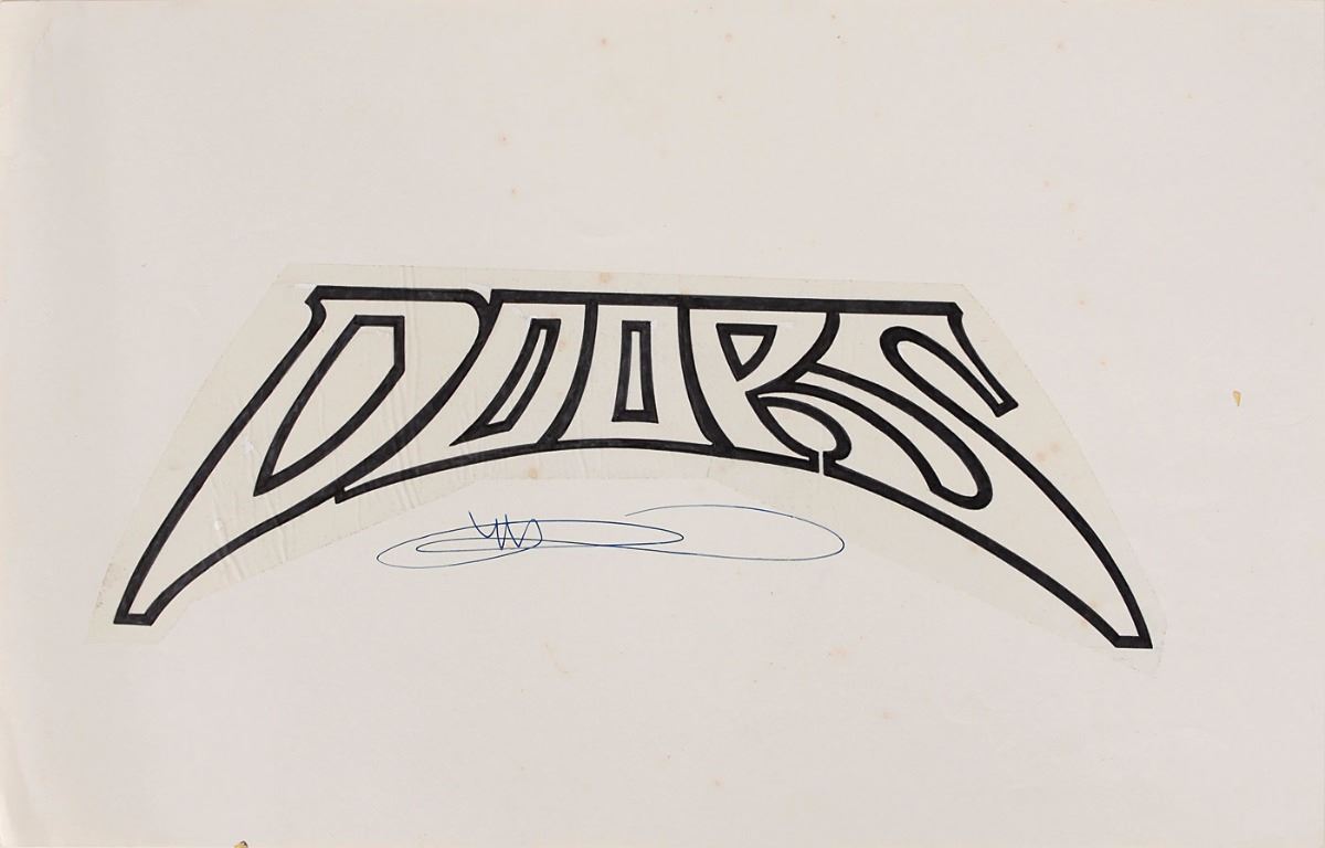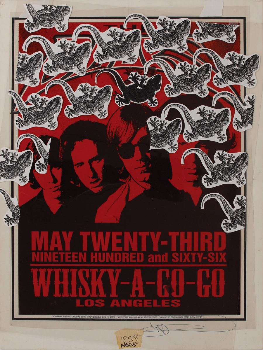 Collection of poster production materials from the archives of artist Mark Arminski: a color 20 x 26 artist’s proof of the 1995 poster created by Arminski to honor the Doors show at the Whisky-A-Go-Go in 1966, signed in the lower border by Arminski; original felt tip artwork of the “Doors” name on a sheet of tracing paper affixed to a 17 x 11 sheet, signed on the sheet by Arminski; and two of the mechanical separations used in printing the poster, one being a black image of the main design with a red acetate “Doors” overlay, and the other being a transparency with applied gecko images. In overall fine condition. Accompanied by a certificate of authenticity signed by Arminski.