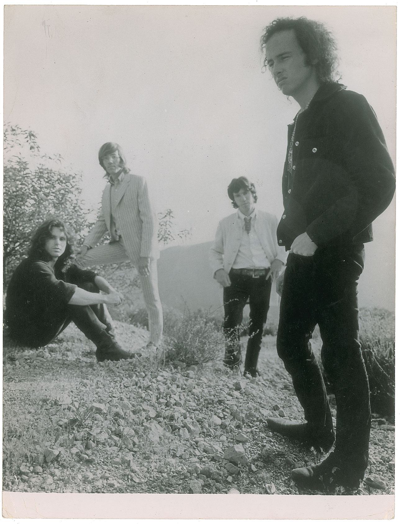 Uncommon vintage glossy 7.25 x 9.5 photo of the Doors posing on a California hillside, with reverse bearing Ingeborg Schober and Metronome credit stamps. In very good to fine condition, with scattered light creasing and surface impressions. Accompanied by a certificate of authenticity from Tracks.