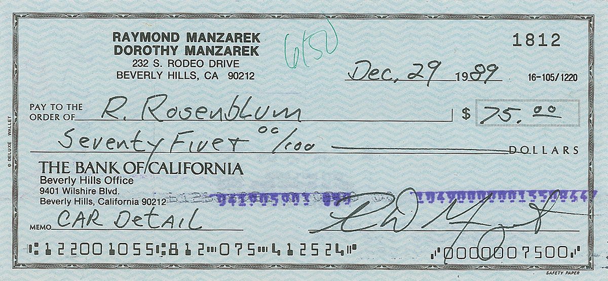 Personal check, 6 x 2.75, filled out and signed by Manzarek, payable to R. Rosenblum for $75.00, December 29, 1989, with “Car detail,” written in the memo line. In fine condition, with a central vertical fold and a bank stamp touching top of signature.