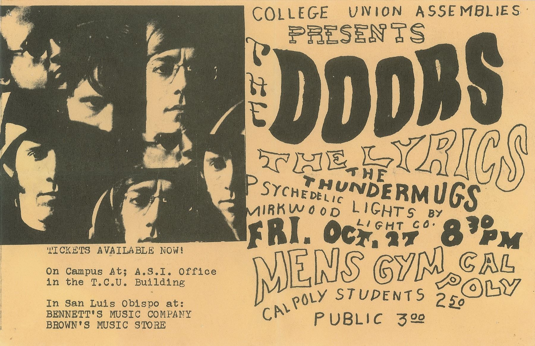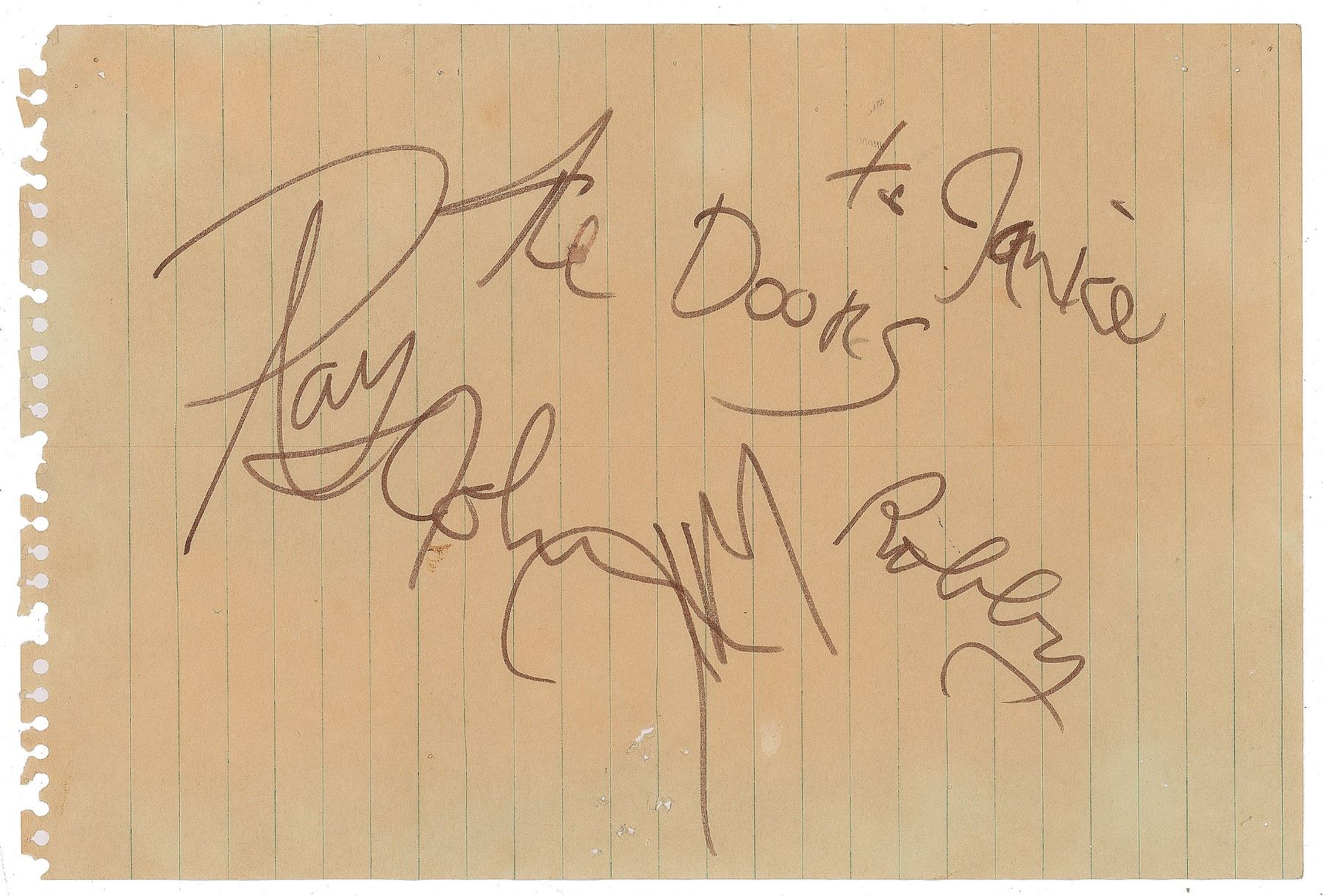 Super desirable vintage felt tip signatures, "Jim," "Ray," "John," and "The Doors, Robby," who adds the inscription, "to Janice," on an off-white 9 x 6 sheet of notebook paper. Includes the extremely rare original 8.5 x 5.5 handbill for Doors concert held at California Polytechnic State University in San Luis Obispo, California, on October 27, 1967, at which these signatures were obtained. In very good to fine condition, with light toning, and many pin-sized holes (and some slightly larger tack-sized holes to the bottom of the sheet). Accompanied by a letter of provenance from original recipient, stating that she witnessed the signing of these autographs.