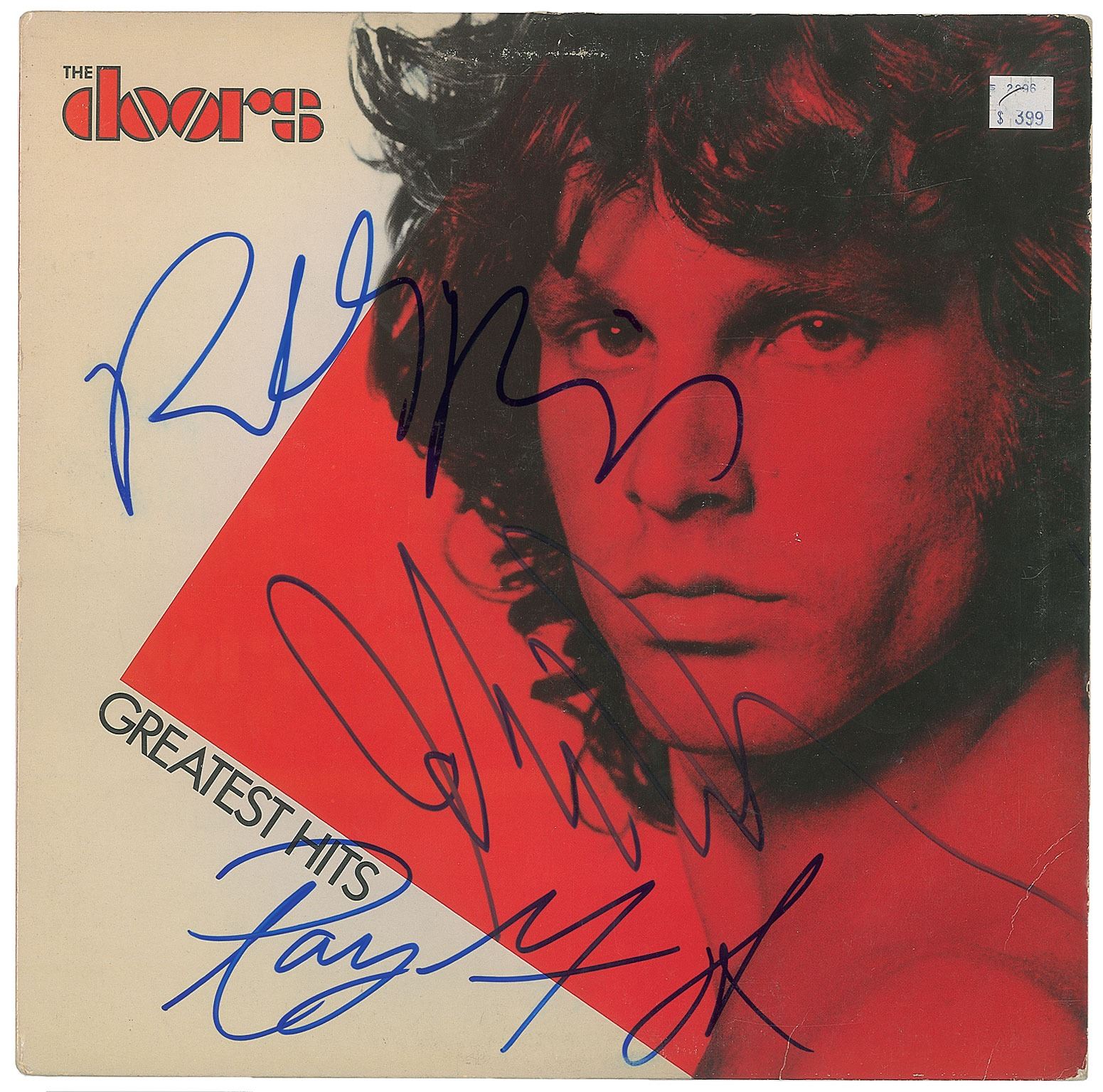 The Doors: Greatest Hits album signed on the front cover in blue felt tip by Ray Manzarek, Robby Krieger, and John Densmore. In fine condition, with an affixed price sticker. The record is not included.