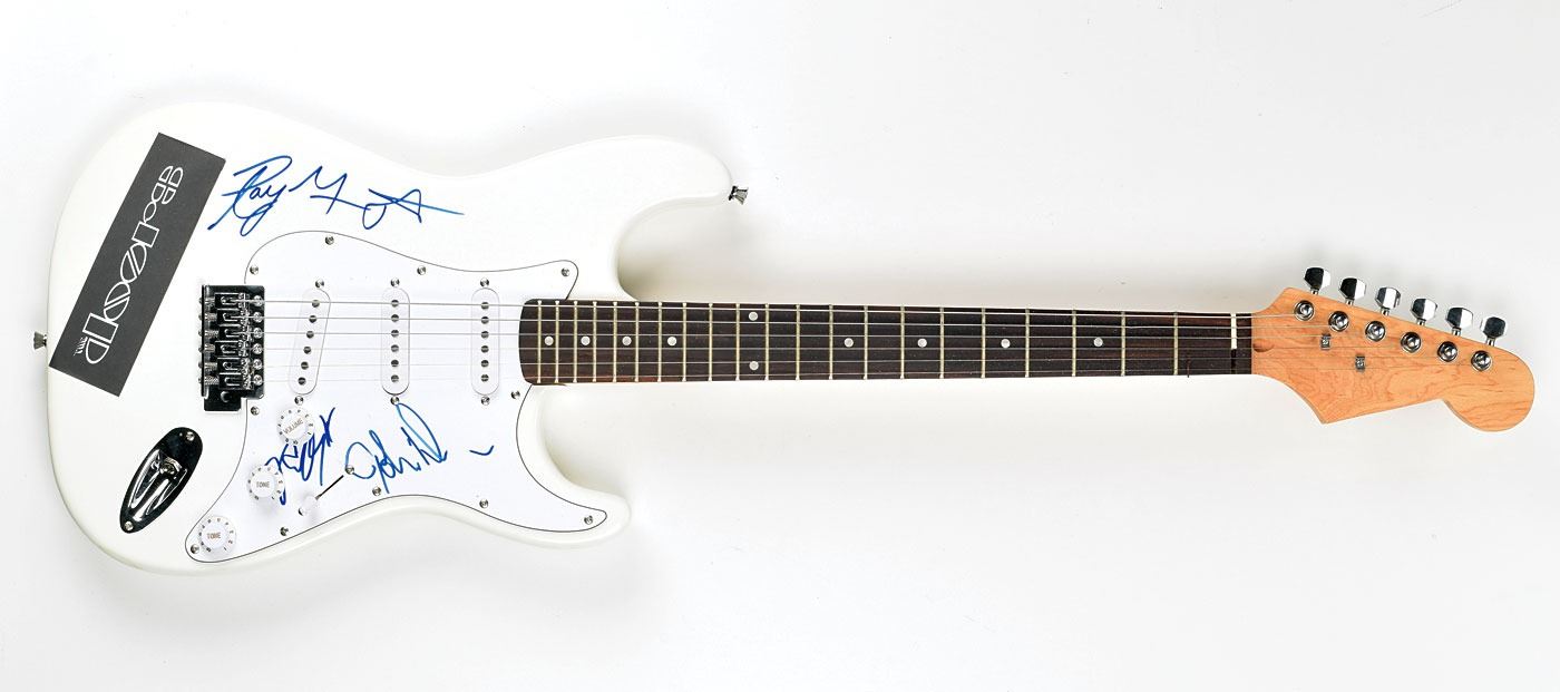 White-bodied Stratocaster-style electric guitar with an affixed Doors logo sticker, signed on the body in blue felt tip by Ray Manzarek, and on the white pickguard by Robby Krieger and John Densmore. In fine condition, with smudging to ink, not affecting the signatures.