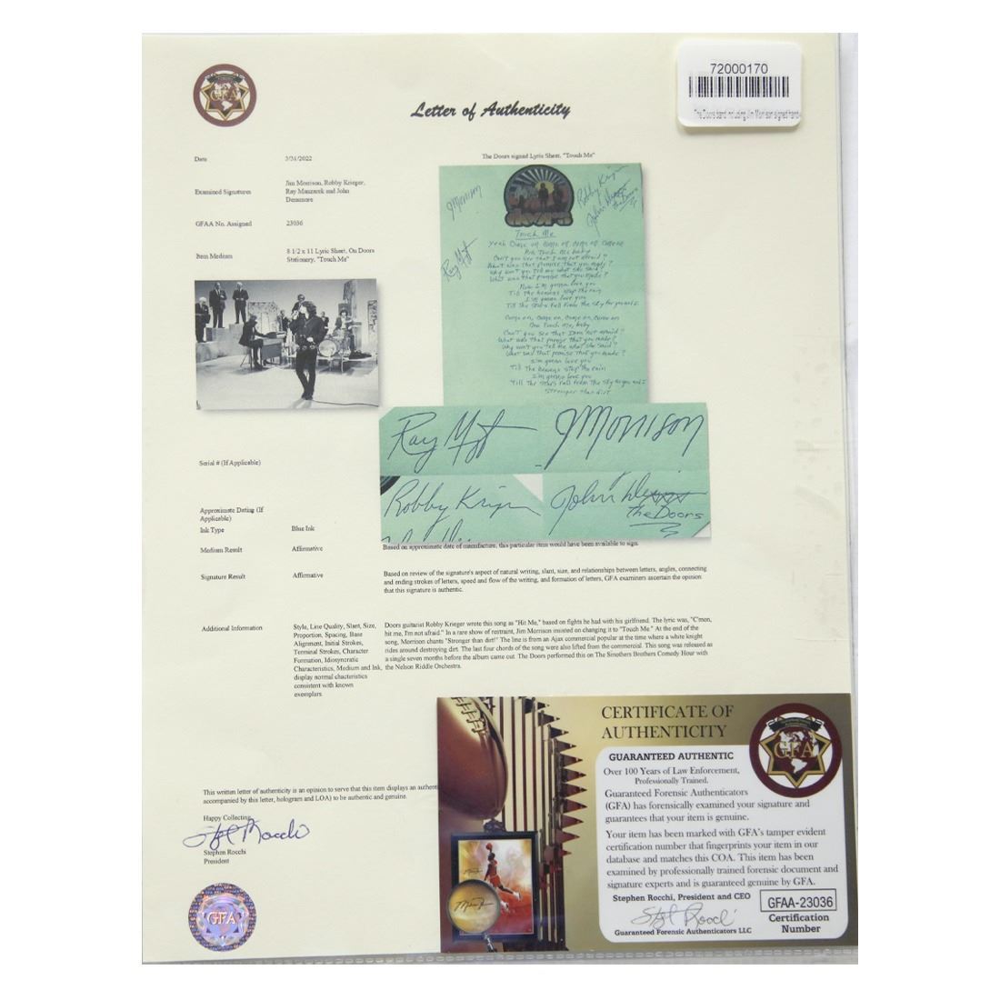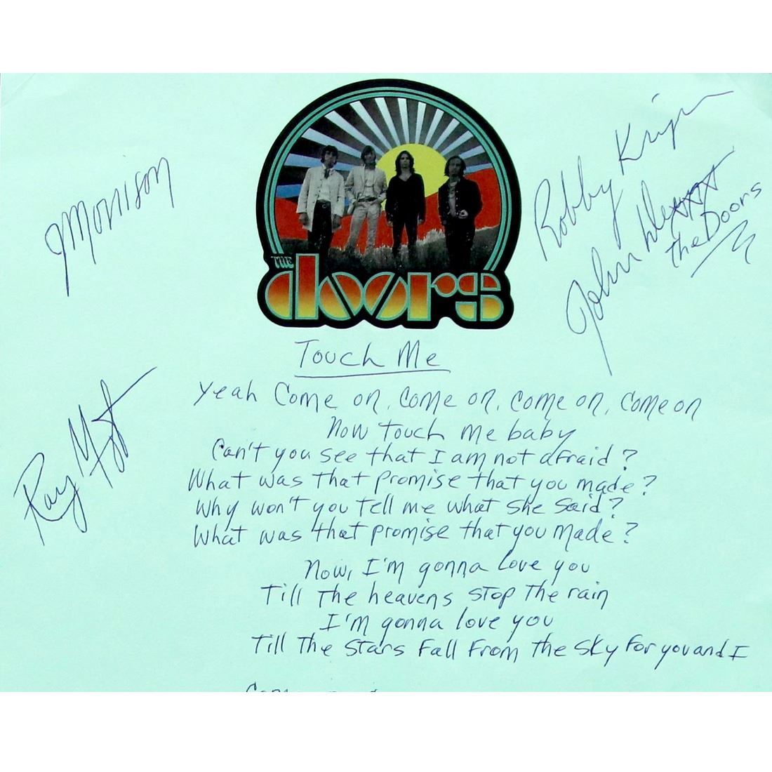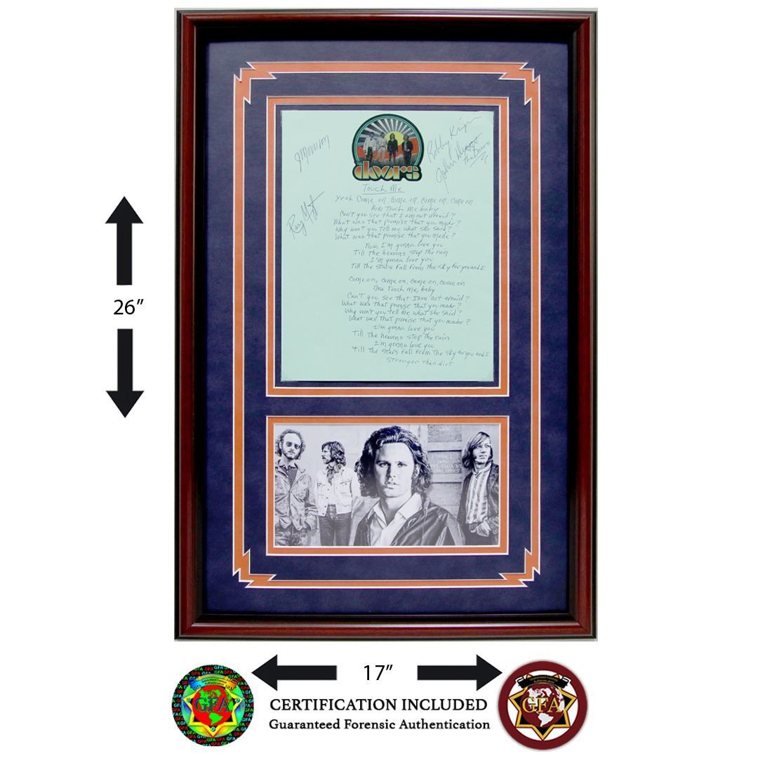 The Doors (Years Active 1965-1973, 1978) signed 8 ½ X 11 Lyric Sheet, “Touch Me” All four signed in blue ink on Doors Green Header Stationery. Doors guitarist Robby Krieger wrote this song as "Hit Me," based on fights he had with his girlfriend. The lyric was, "C'mon, hit me, I'm not afraid." In a rare show of restraint, Jim Morrison insisted on changing it to "Touch Me." This was released as a single seven months before the album came out. This song was popular around the time Jim Morrison was arrested in Miami for indecent exposure. The song had nothing to do with Morrison's arrest, apart from an unfortunate title, but some radio stations refused to play it as a result. It was released as a single in December 1968 and reached No. 3 on the Billboard Hot 100 (their last Top Ten hit in US) and No. 1 in the Cashbox Top 100 in early 1969 (the band's third American number-one single). This item has been professionally custom matted and framed. Comes with a Letter of Authentication from Guaranteed Forensic Authenticators, along with the GFA guarantee of authenticity.