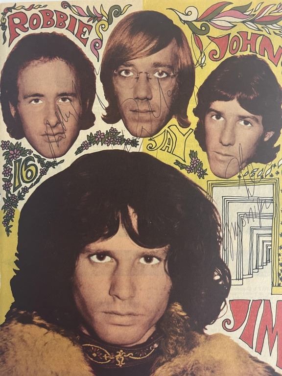 The Doors signed magazine page autographed by Jim Morrison, Ray Manzarek, Robby Krieger and John Densmore. 8x10 inches. DB195