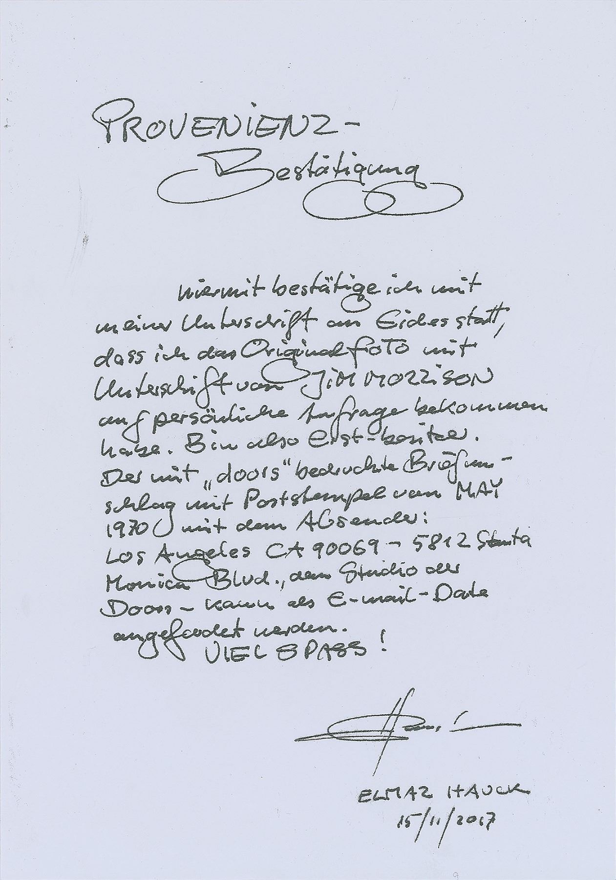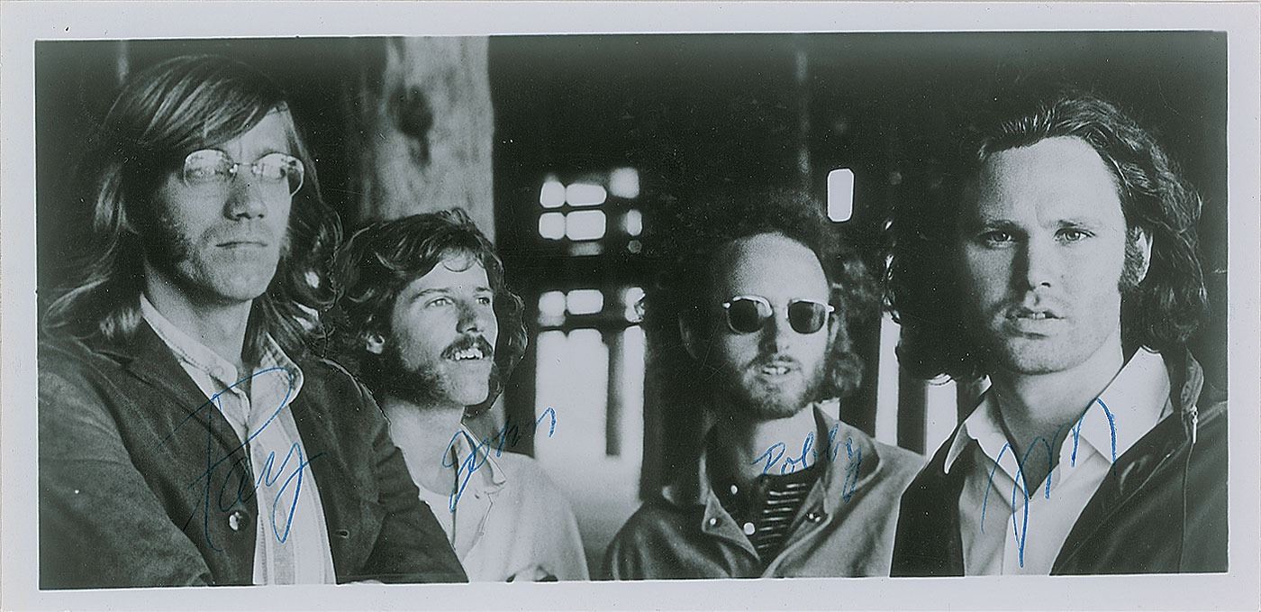 Exceedingly rare vintage glossy 8 x 4 panoramic photo of The Doors side-by-side, signed in blue ballpoint by all four members using their first names only: Jim Morrison, "Jim"; Ray Manzarek, "Ray"; John Densmore, "John"; and Robby Krieger, "Robby." In fine condition, with small mounting remnants to reverse. Accompanied by a copy of a letter of provenance from the original recipient (in German), and a color copy of the original mailing envelope. Captured circa 1969 at Venice Pier by noted rock photographer Henry Diltz, this is a classic portrait of the legendary group—The Doors came to be one of the most popular and successful American rock bands of all time. Fully signed photographs of the band are practically unheard of, and this is a truly spectacular, visually appealing example.