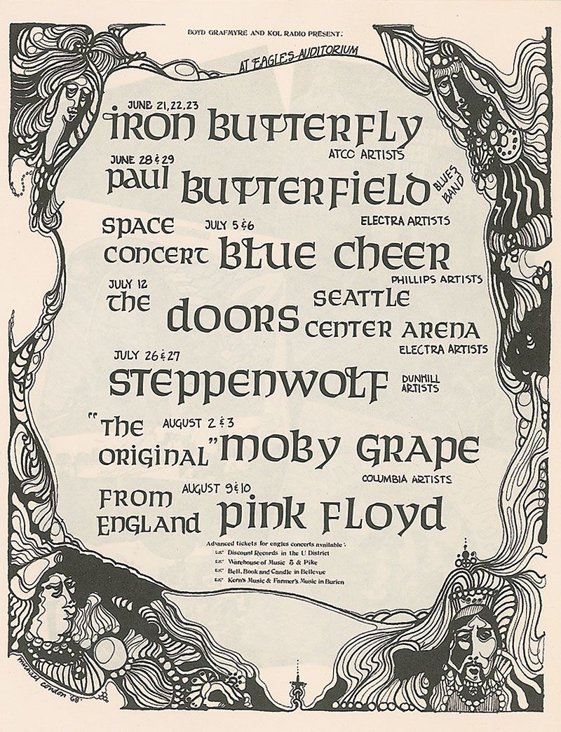 Original vintage handbill for the 1968 summer concert lineup at Eagles Auditorium in Seattle, 8.5 x 11, featuring appearances by Iron Butterfly, Paul Butterfield, Blue Cheer, The Doors, Steppenwolf, Moby Grape, and Pink Floyd. Reverse features images of the various bands’ album covers. In very fine condition.