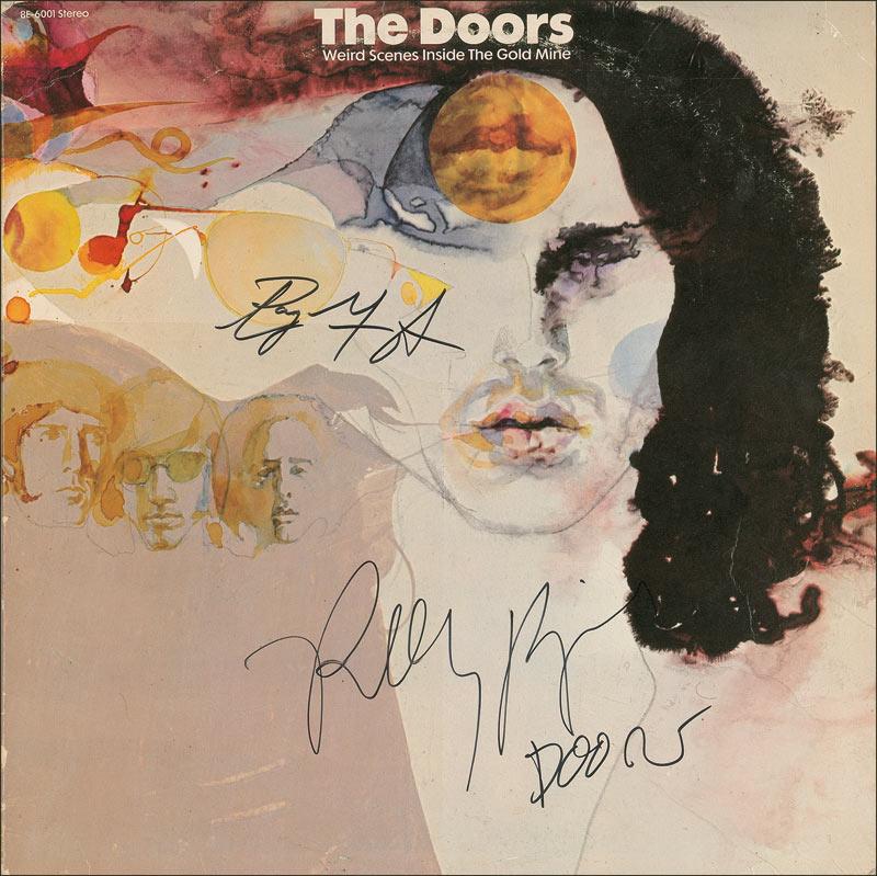 Weird Scenes Inside the Gold Mine album signed on the front cover in black felt tip by Ray Manzarek and Robby Krieger, who adds the band’s name. Light ‘ring of wear’ and scattered surface creases, otherwise fine condition. The record is not included.