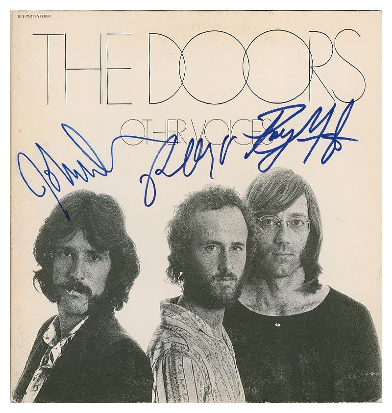 Other Voices album signed on the front in blue felt tip by John Densmore, Ray Manzarek, and Robby Krieger. In fine condition, with some light rubbing, and light ‘rings of wear.’ The record is not included.