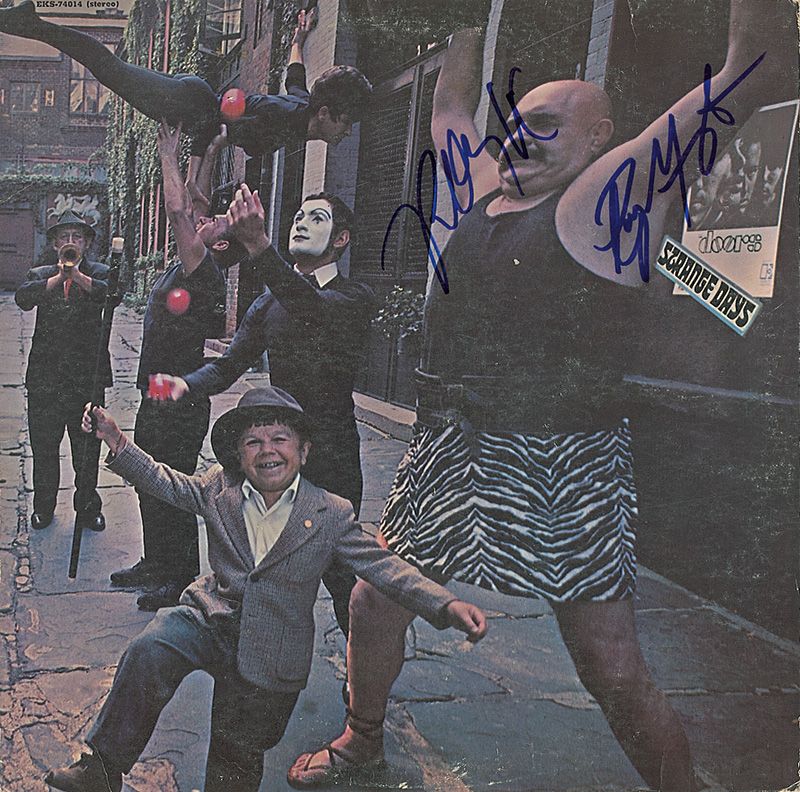 Strange Days album signed on the front cover in blue felt tip by Ray Manzarek and Robby Krieger. Scattered surface wear and creases to covers, otherwise fine condition. The record is not included.