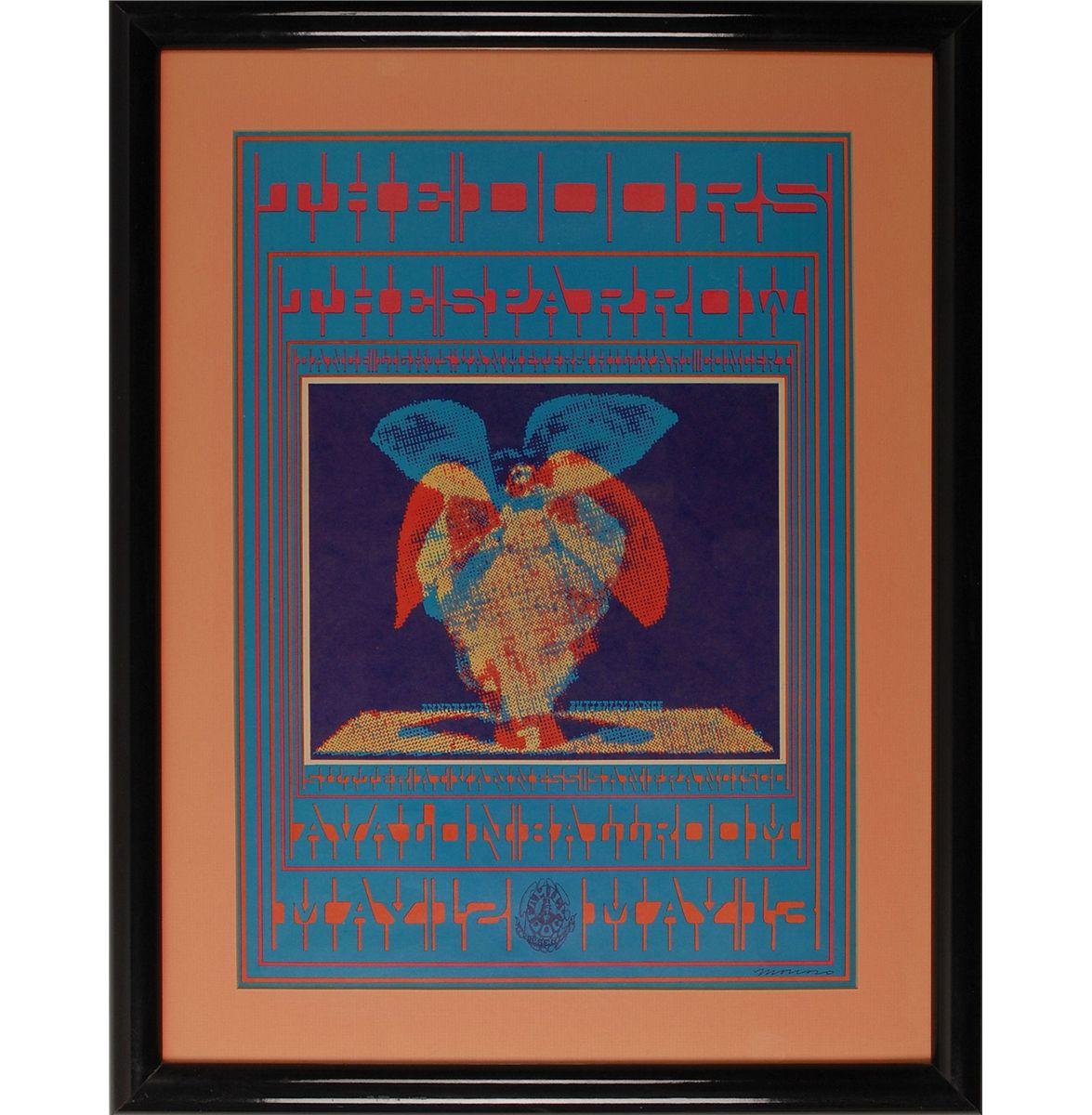 Original Family Dog concert poster for The Doors and The Sparrow at the Avalon Ballroom on May 12–13, 1967. Colorful poster, measuring 13 x 18.25, was designed by Victor Moscoso, with a psychedelic butterfly image in the center. Matted and framed to an overall size of 19 x 24. In fine condition, with some slight fading to colors. Provenance: Joey Ramone Estate. Accompanied by a letter of authenticity from the Joey Ramone Estate.