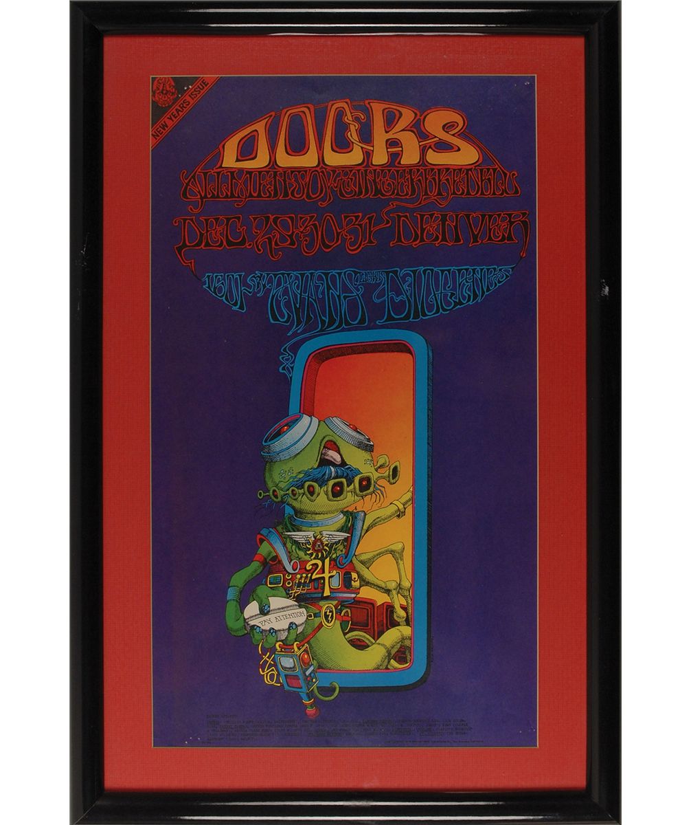 Printed Family Dog concert poster for The Doors engagement in Denver, Colorado, on December 29–31, 1967. Color poster measures 21.5 x 12.25, was designed by Rick Griffin, with the Family Dog logo presented in a black triangle in the upper left, and a multi-armed alien emerging from a door. Matted and framed to an overall size of 18 x 27. In fine condition. Provenance: Joey Ramone Estate. Accompanied by a letter of authenticity from the Joey Ramone Estate.