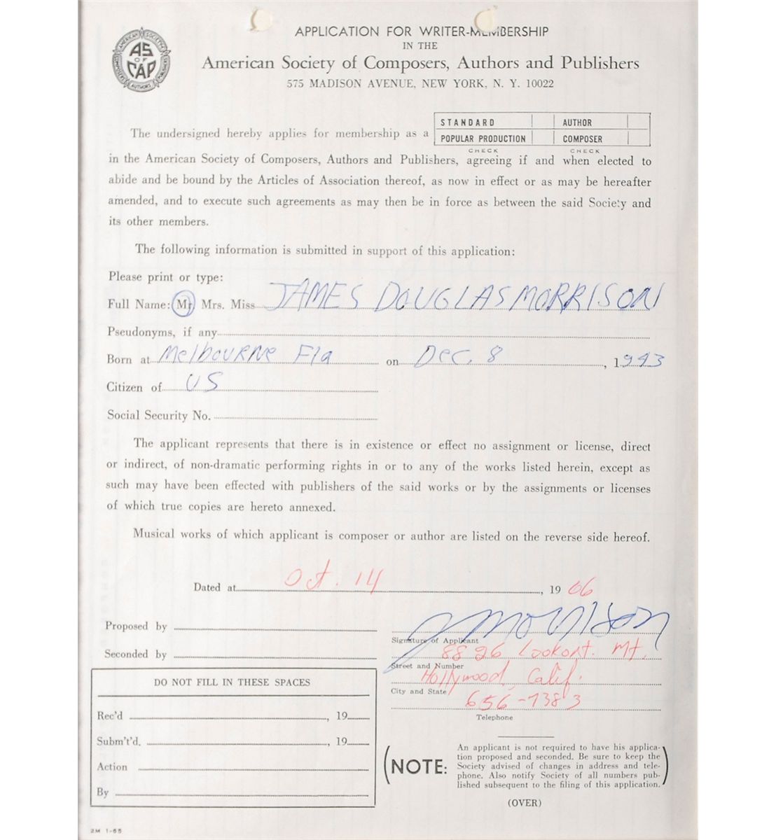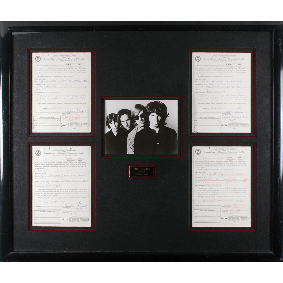 The Doors’s individual applications for writer membership in the American Society of Composers, Authors, and Publishers, each one page, 7.5 x 10, all dated between October 10–14, 1966, and each filled out and signed by a member of the group. Jim Morrison has printed his full name, “James Douglas Morrison,” on the first line, listed his place of birth, “Melbourne, Florida,” signing at the bottom, “J. Morrison,” adding his current Hollywood, California, address underneath. The three remaining members have also printed out their full names, places of birth, current California addresses, and signed “Raymond A. Manzarek,” “John Densmore,” and “Robert A. Krieger,” at the bottom of their respective application. All four are triple-cloth-matted and framed with a group portrait and a small plaque to an overall size of 36.5 x 31. In fine condition.