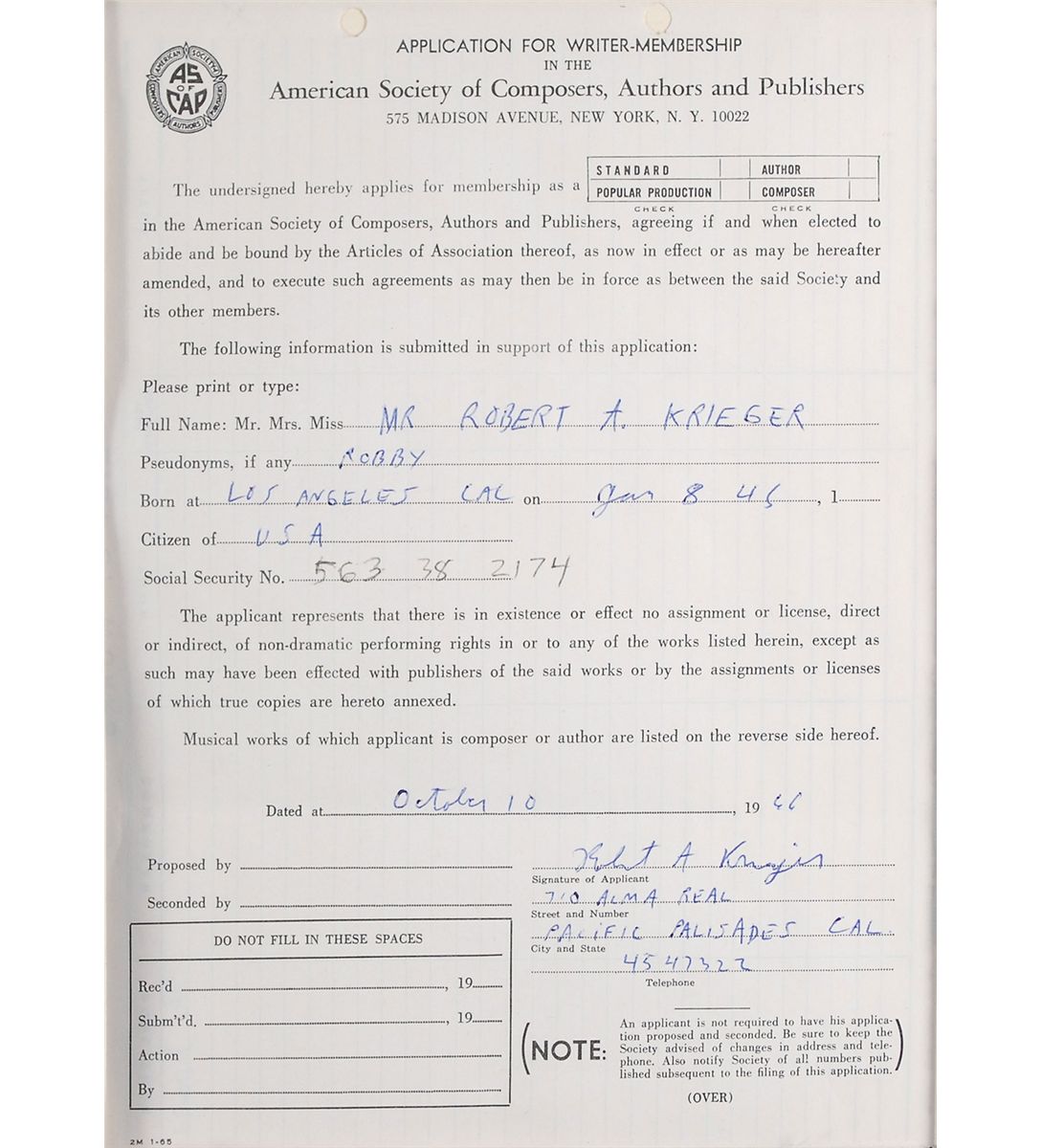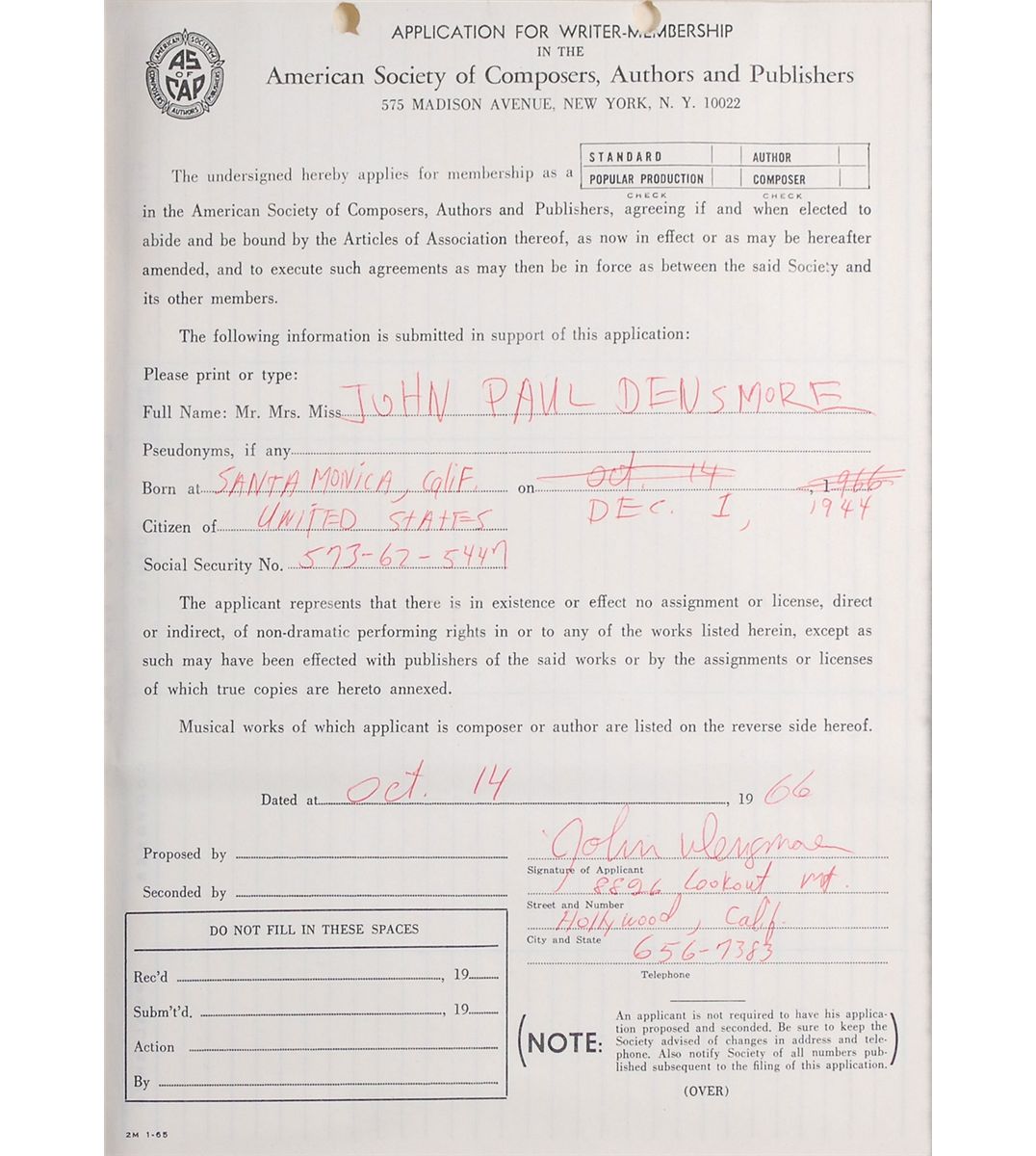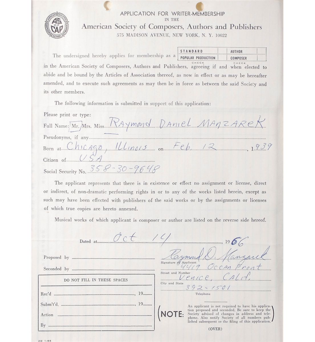 Having recorded their first album at the end of August 1966, it became necessary for the band to join the organization, to protect their musical rights when the album would be released in January of 1967. Joining the likes of Jimi Hendrix and Janis Joplin, who were also members, these applications allowed the band to receive royalties from the performances of their songs. The band’s first televion performance occurred in late 1966 or early 1967 on the Los Angeles television show, Boss City, and later on Shebang, performing ‘Break On Through.’ These applications, each filled out by the band members, represent one of the earliest, and arguably one of the most important, collection of Doors items available.
