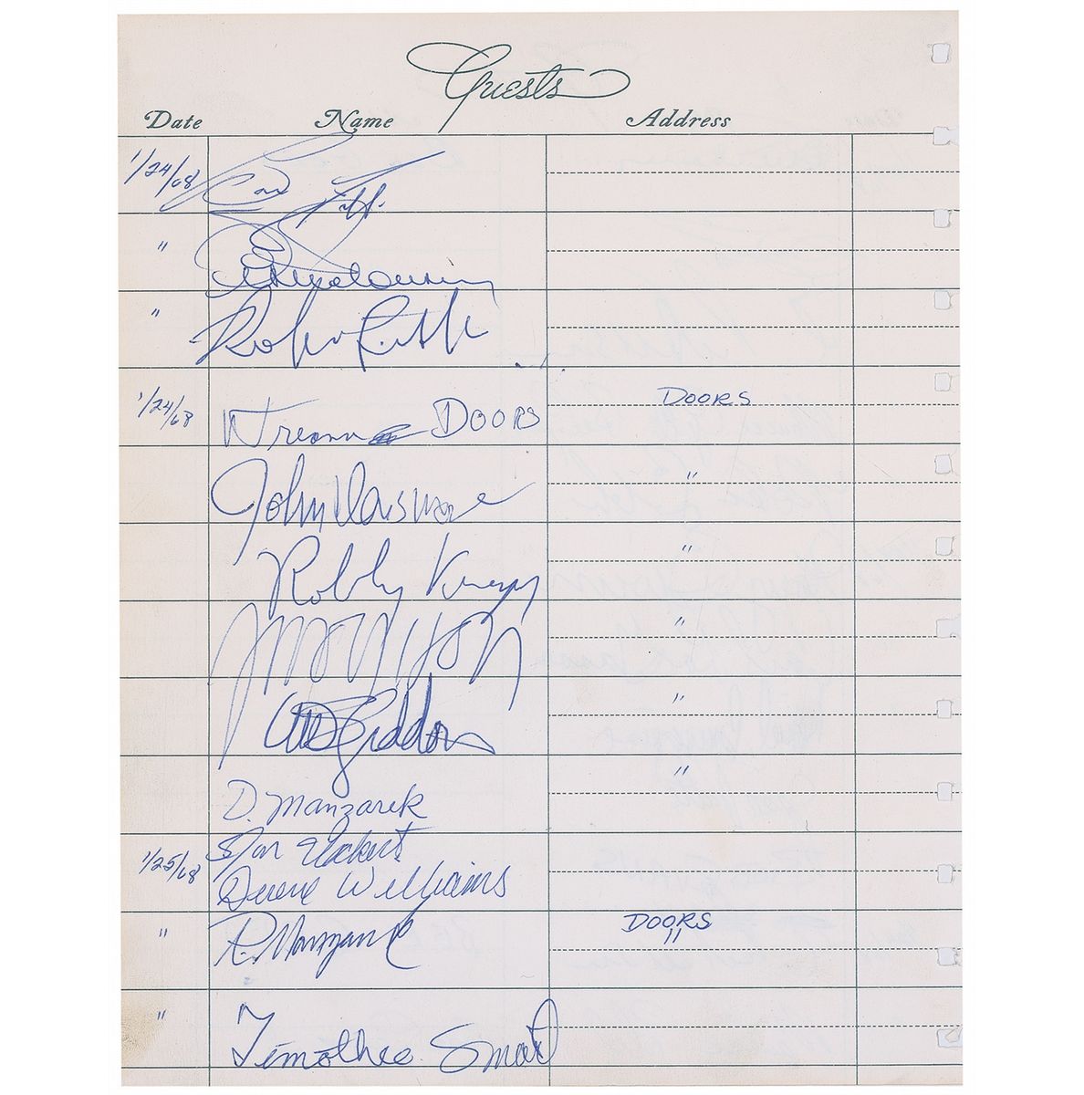 Vintage ballpoint signatures, “J. Morrison,” “John Densmore,” “Robby Krieger,” and “R. Manzarek,” on a 7 x 8.75 guest register page from a Los Angeles recording studio sign-in book, dated January 24, 1968. Vince Treanor, the Doors longtime road manager, signed above the musicians’ signatures, adding the band’s name. Above Treanor’s signature and on the opposite side of the page are signatures of Bee Gees musicians and personnel, including Barry Gibb (2), Maurice Gibb (2), Robin Gibb (2), and Colin Petersen (2). In fine condition.