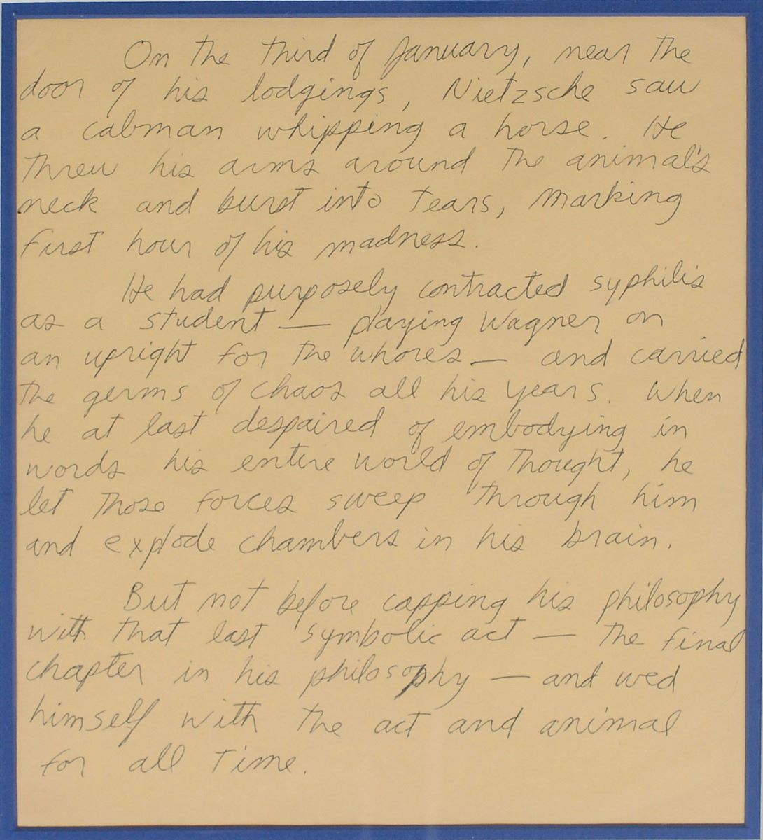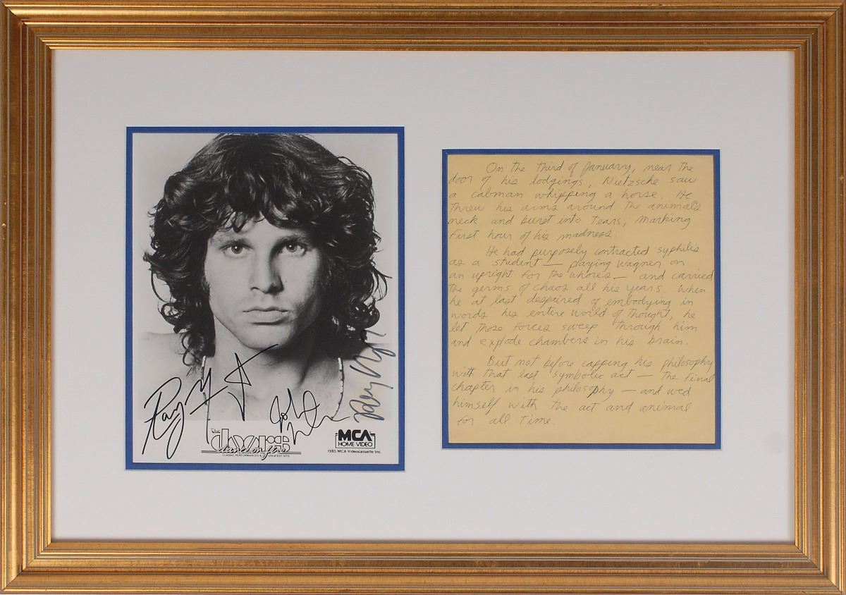 Exceedingly desirable handwritten manuscript by Jim Morrison, unsigned, one page, 7.5 x 8.5, no date but circa 1960s. In full: “On the third of January, near the door his lodgings, Nietzsche saw a cabman whipping a horse. He threw his arms around the animal's neck and burst into tears, marking first hour of his madness. He had purposely contracted syphilis as a student—playing Wagner on the upright for the whores—and carried the germs of chaos all his years. When he at last despaired of embodying in words his entire world of thought, he let those forces sweep through him and explode chambers in his brain. But not before capping his philosophy with that last symbolic act—the final chapter in his philosophy—and wed himself with the act and animal for all time.” Includes a glossy 7.5 x 9.5 MCA publicity photo of Morrison, signed in black felt tip by his bandmates Ray Manzarek, John Densmore, and Robby Krieger. Handsomely double-matted and framed together to an overall size of 24.5 x 17.5. In overall fine condition, with mild haloing to Manzarek’s signature.