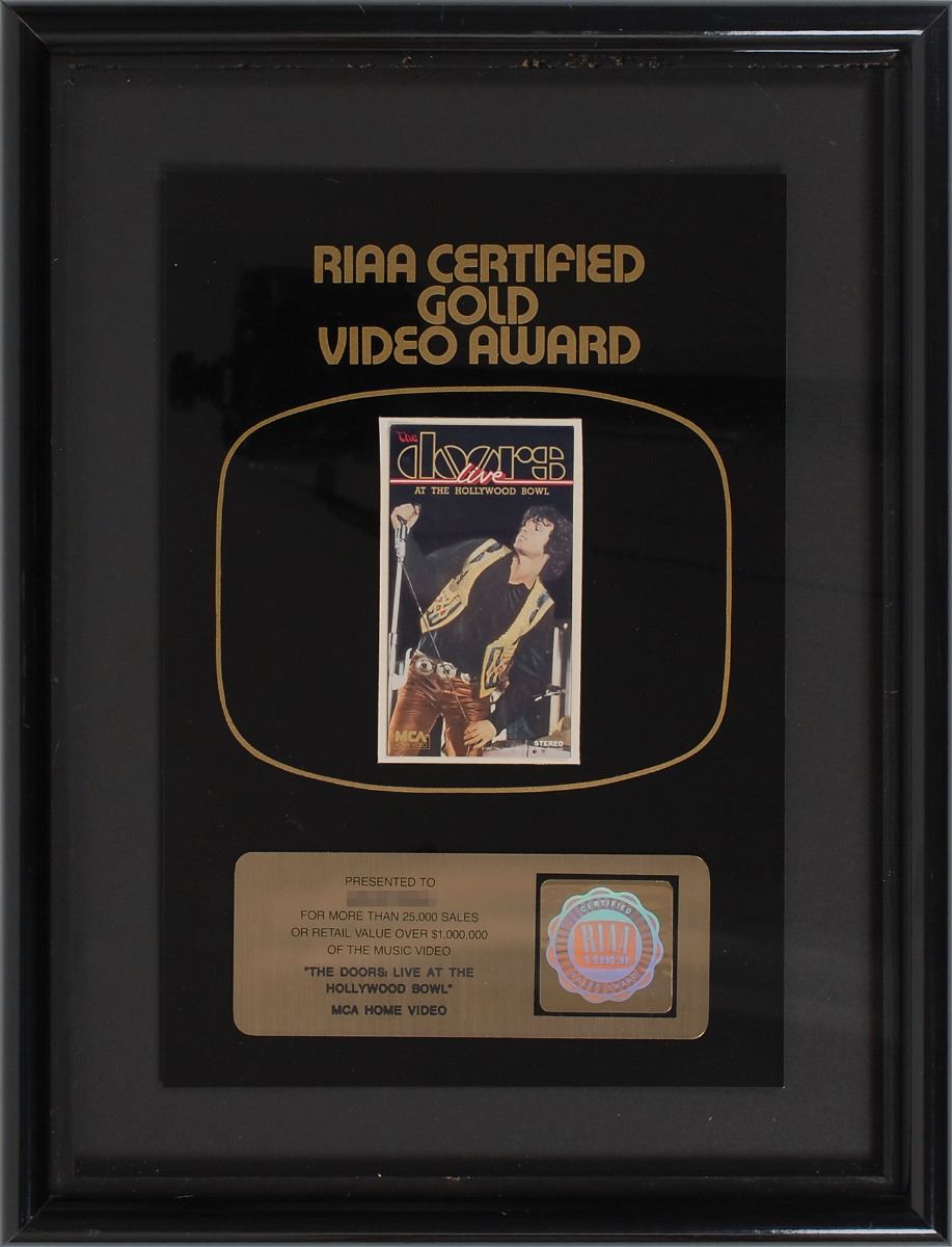 Uncommon official flower hologram-style RIAA gold video award “for more than 25,000 sales or retail value over $1,000,000 of the music video ‘The Doors: Live at the Hollywood Bowl,’ MCA Home Video.” Framed with its plate and a small cover of the home video to an overall size of 13 x 17. Award retains its original tape-repaired backing. In fine condition.