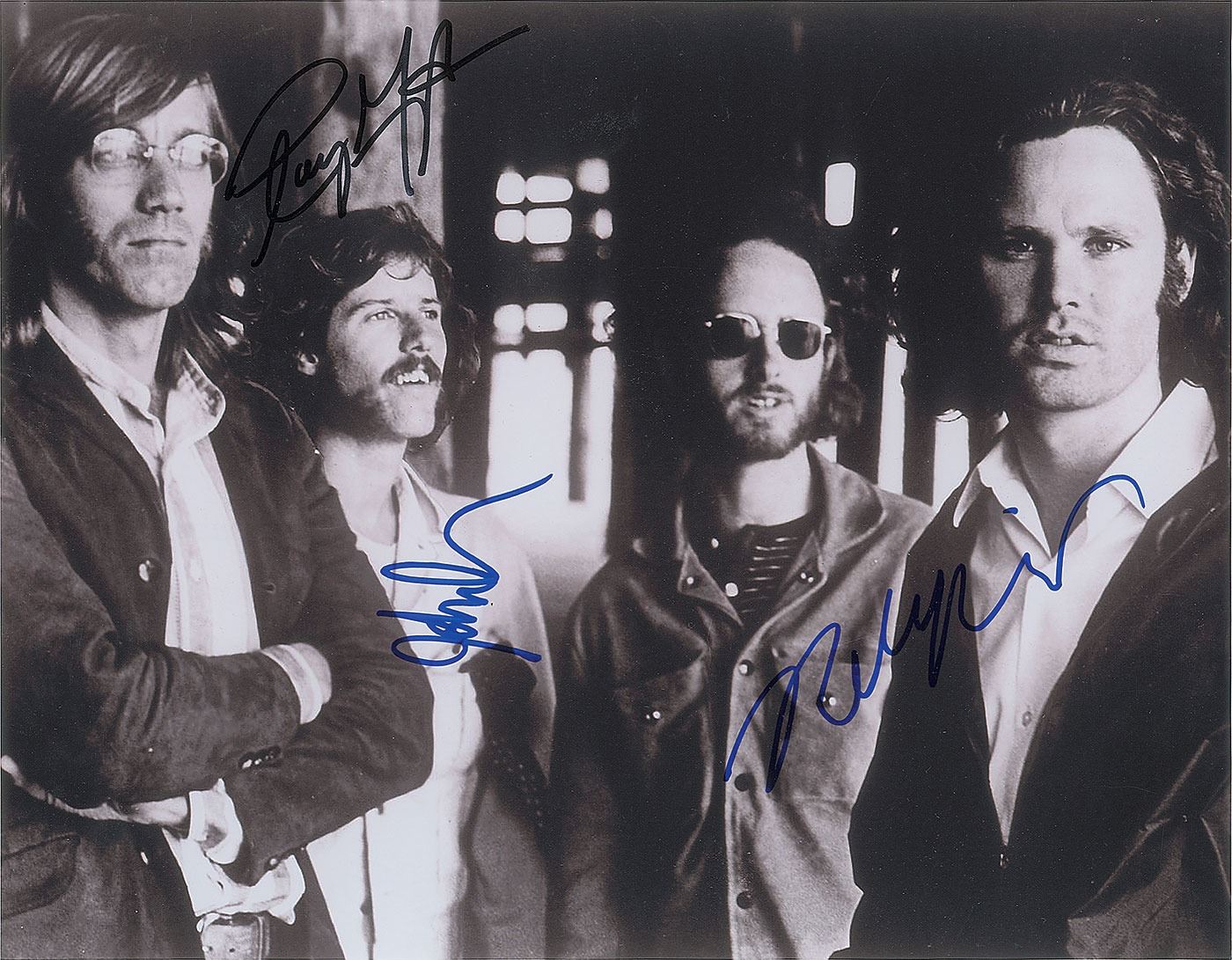 Satin-finish 14 x 10.75 photo of The Doors, signed in blue felt tip by John Densmore and Robby Krieger, and in black felt tip Ray Manzarek. In fine condition.