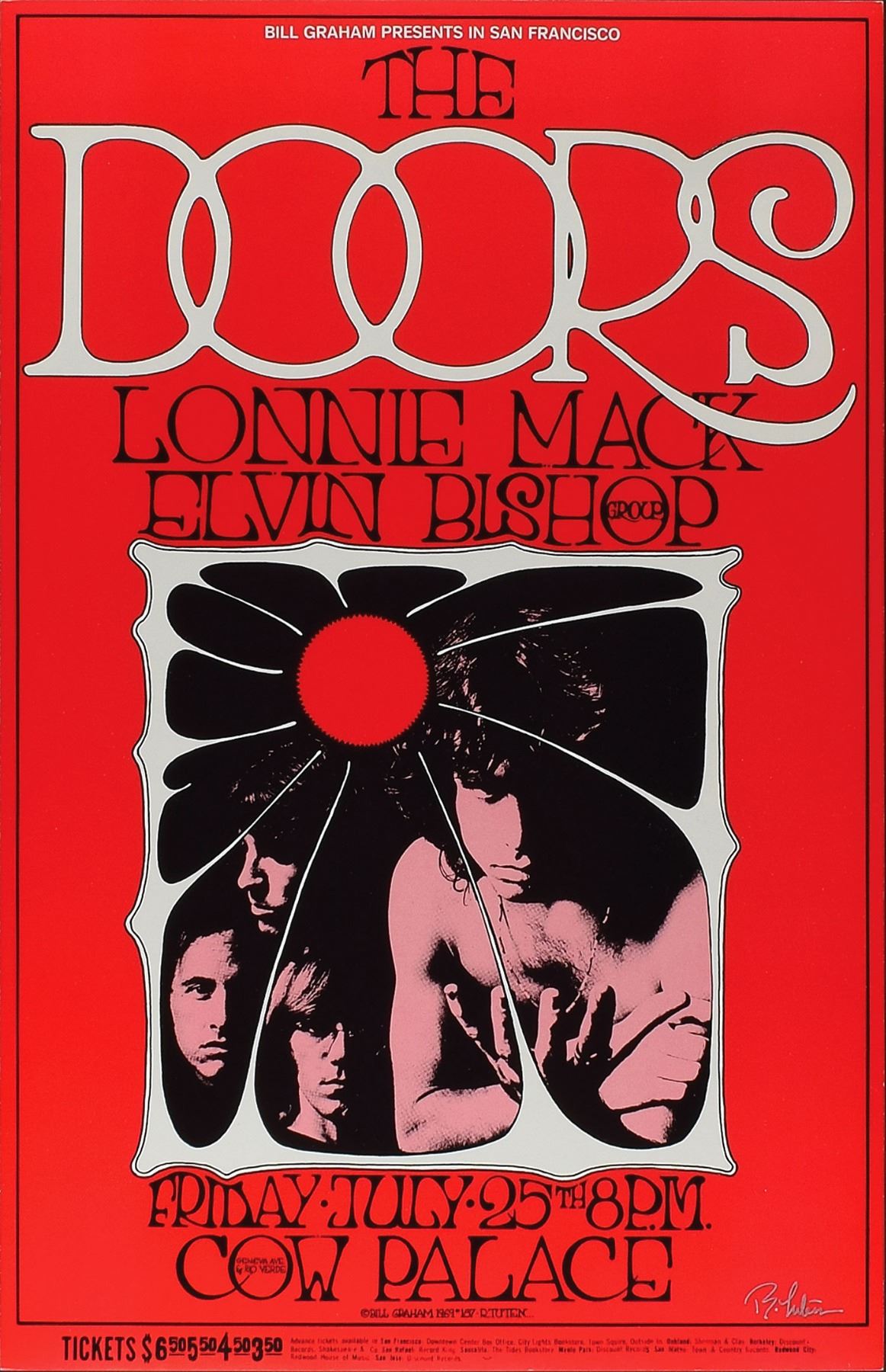 Original color 14 x 21.75 second printing poster for The Doors, Lonnie Mack, and Elvin Bishop at San Francisco's Cow Palace on July 25, 1969, presented by Bill Graham (BG-186), signed in the lower right corner in silver ink by the artist, Randy Tuten. In fine condition.