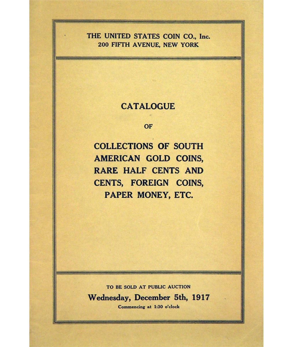 United States Coin Company. CATALOGUE OF A COLLECTION OF SOUTH AMERICAN GOLD COINS, INCLUDING A REMARKABLE SERIES OF COLOMBIA; THE HALF CENT COLLECTION OF DR. GEORGE P. FRENCH; A COLLECTION OF CENTS IN REMARKABLE PRESERVATION; RARE MASSACHUSETTS COLONIAL CURRENCY; CHOICE FOREIGN SILVER COINS AND MANY OTHER ITEMS. New York, Dec. 5, 1917. 8vo, original printed card covers. 25, (1) pages; 628 lots. Fine. Scarce. Adams B+: "Fine Mass. notes. Excellent copper from Dr. French: MS half cents, near complete; important cents, most of which re-appear in 1928 FPL."