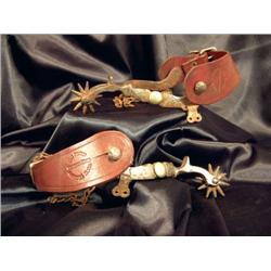 Pair of Old Spurs with nickel buttons and leathers by Mel Parker Amherst, NB. Poor condition.