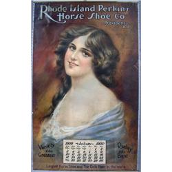 Rhode Island Perkins Horseshoe Company 1909 calendar. When was the last time you saw a pretty lady advertising Horse Shoes? Print dated 1902, calendar