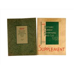 Two Coca Cola Bottlers Advertising Price Lists, for 1930 and 1933. Excellent condition. 8 1/2 X 11 inches.