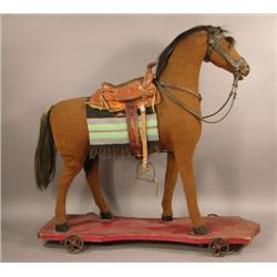 Toy Pull Horse made of burlap with real horse hair. Has contemporary tooled saddle and woven blanket. Iron wheels and wood base. 30 X 29 1/2 inches.