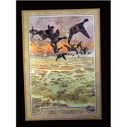 E.C. Schultze Shot Shell Poster, Dupont Powder Company. Artist Lynne Bogue Hunt, entitled Get Your Shot Out There, depicting ducks flying over marsh,