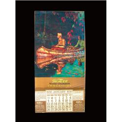 1930 Western Champion Ammunition Calendar, P.C. Parsons artist, The Veteran. Depicting hunter and Indian in a canoe. Small tear at 3:00, normal edge w
