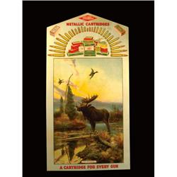 Western Metallic Cartridges Cardboard Die Cut Sign. Entitled The Warning, artist H. Edwards, depicting moose and ducks. Some minor staining, probably