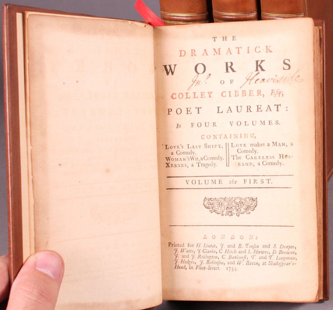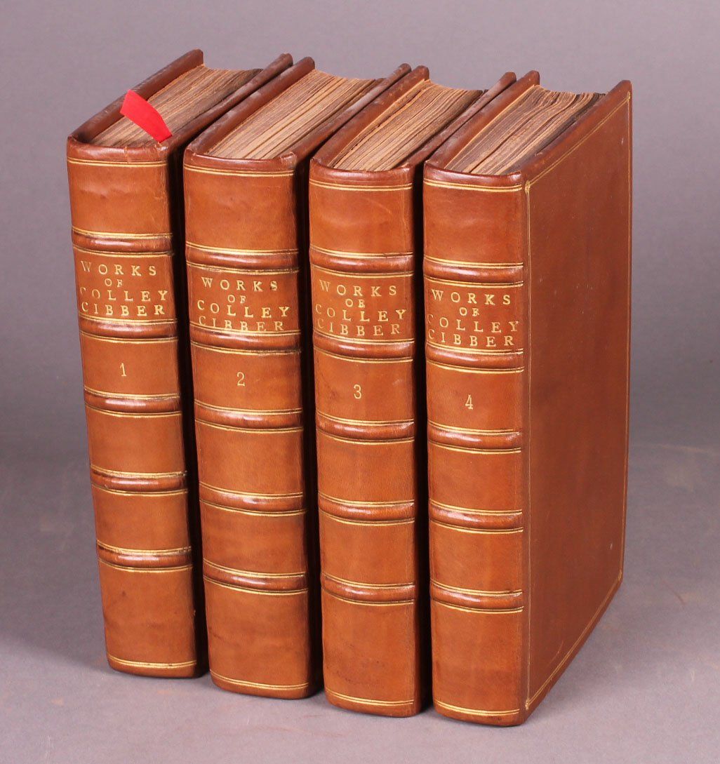 [Literature/Drama]. THE DRAMATICK WORKS OF COLLEY CIBBER, ESQ; Poet Laureat? 4 Vols. Lon: H. Linton, J. and R. Tonson and S. Draper, et. al., 1754. 12mo. Modern full leather. 8 frontises (only?) ESTC T167708. ++ Vol I contains: Love?s Last Shift, Woman?s Wit, Xerxes, Love makes a Man, The Careless Husband. [1-13], 14-95, [1], [i]-vi, [7]-107, [1], [1-7], 8-68, [3]-[7], 8-83, [1], [3]-[13], 14-94, [2] pp, 2 frontises. ++ Vol II: The Lady?s Last Stake, The Comical Lovers, She Wou?d and She Wou?d Not, Richard the Third, The Rival Fools. 1 frontis. ++ Vol III: Perolla and Izadora, The Sick Lady?s Cure, The School-Boy, Venus and Adonis. Vol III lacking main title page. 1 frontis. ++ Vol IV: Ximena, Caesar in Egypt, The Provok?d Husband, Love in a Riddle. Vol IV lacks its main title page. 4 frontises.