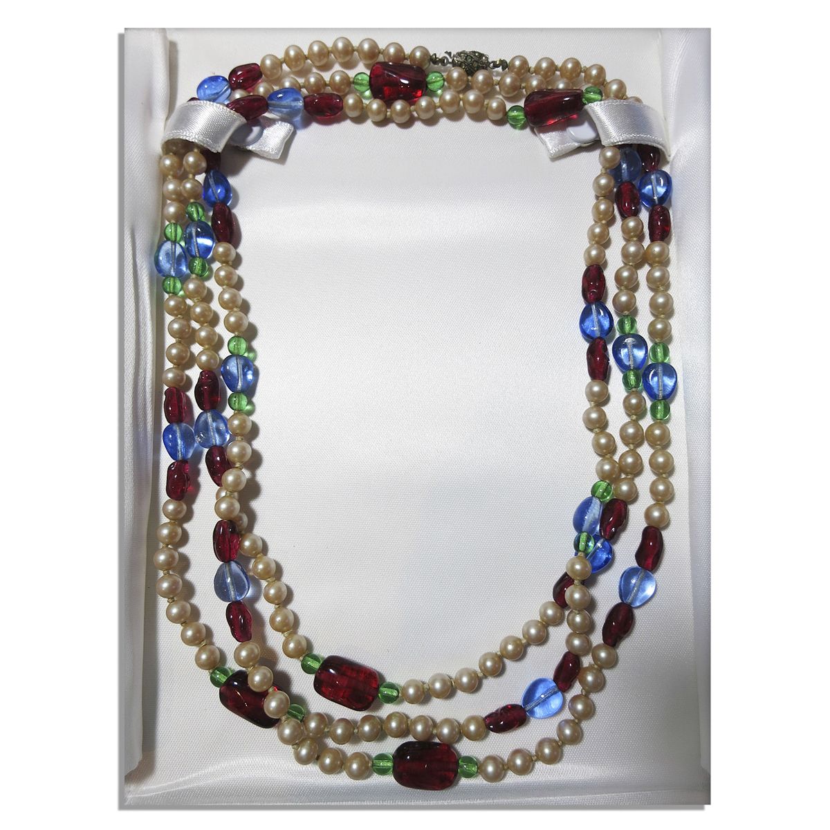 Wallis Simpson, Duchess of Windsor personally owned necklace. Jewelry, possibly faux, is a long string of pearls separated by colored glass beads in red, blue and green. Likely designed by Kenneth J. Lane, necklace features a metal clasp inlaid with sparkling stones. Measures 60'' in total length. A few missing stones to clasp, else near fine. From the 2004 Christie's auction in Rome of the property the Duchess had gifted to her personal assistant, Ophelia Sanegre Belini.