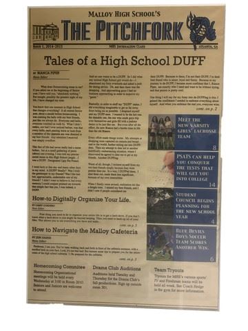 Framed screen used, hero, The Pitchfork high school newspaper with the headline 'Tales of a High School Duff. (approx. 3' x 3', heavy frame)