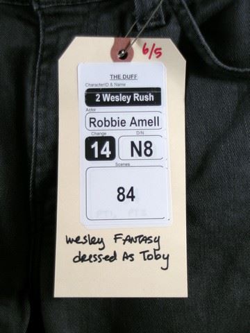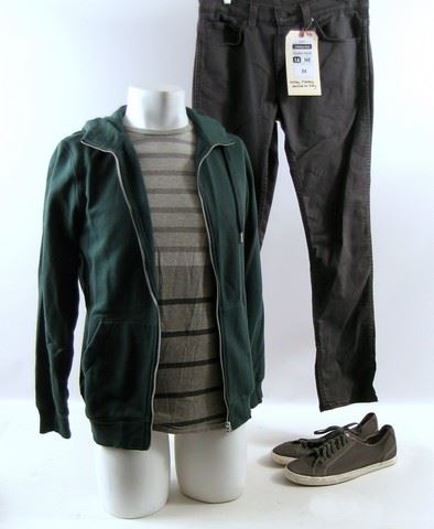 Wesley (Robbie Amell) screen worn, hero, dark green cotton knit zipper up the front long sleeve 'Basic' hoodie, light grey and dark grey horizontal stripe short sleeve crew neck 'Mossimo' t-shirt, dark charcoal grey 'Levis' jeans, and dark olive green canvas with white soles 'Ben Sherman' shoes. Includes wardrobe tag!