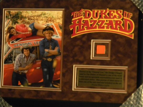 Limited edition framed display featuring an original piece of the first "General Lee" car from the hit television series "The Dukes of Hazzard". This item comes with a certificate of authenticity guaranteed for the life of the piece.