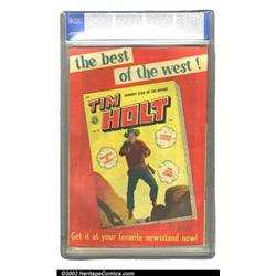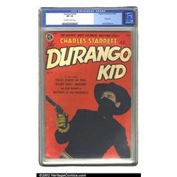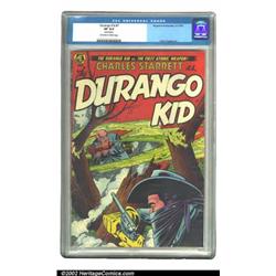 The Durango Kid Lot of #1, #4 and #7 (Magazine Enterprises, 1949). This is a beautiful group lot of Charles Starrett comics, all CGC Graded. #1 is VG+ 4.5 with Off-white pages, a photo cover and Frank Frazetta artwork. #4 is VF- 7.5 with Off-white to white pages, also has Frank Frazetta art and a photo cover. #7 is VF 8.0 with Off-white to white pages, again with Frazetta art, and the cover depicts a man using an atomic weapon to chase down our western hero. Overstreet 2002 value for group = $440. 3 Comic Books Important notice: We expect to be auctioning lots at the rate of 200-250 per hour. Sometimes eBay Premier live bid software cannot keep up with that pace, so we strongly recommend that you place a realistic proxy bid now as insurance to avoid disappointment. Also please note that all Heritage/CAA lots purchased through eBay Premier carry a 20% Buyer's Premium. Please make sure you read the Terms and Conditions.