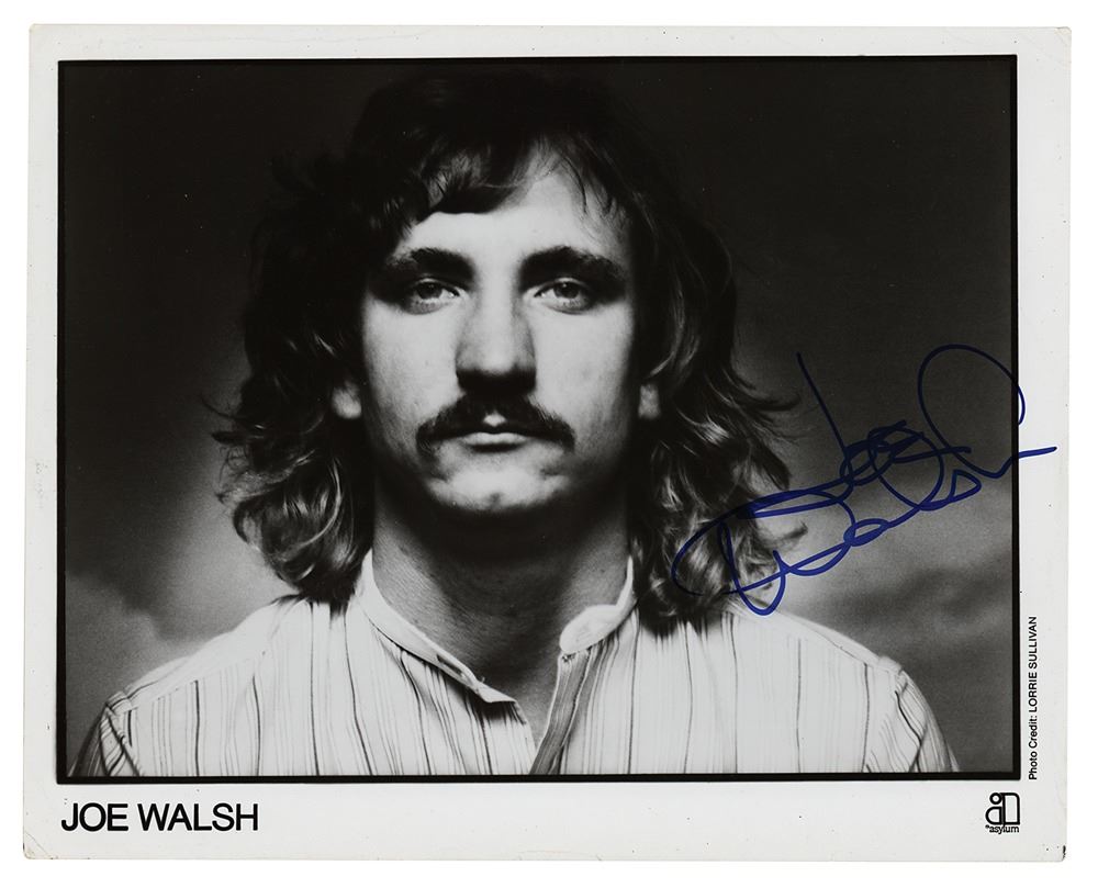 Glossy 10 x 8 Asylum Records promo photo, signed in blue felt tip by guitarist and songwriter Joe Walsh. In fine condition, with creasing to corners. Originally obtained by in-person specialist Mike Wehrmann.