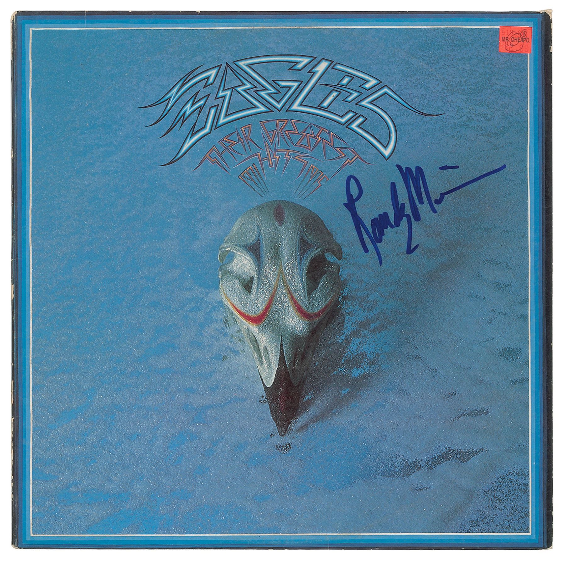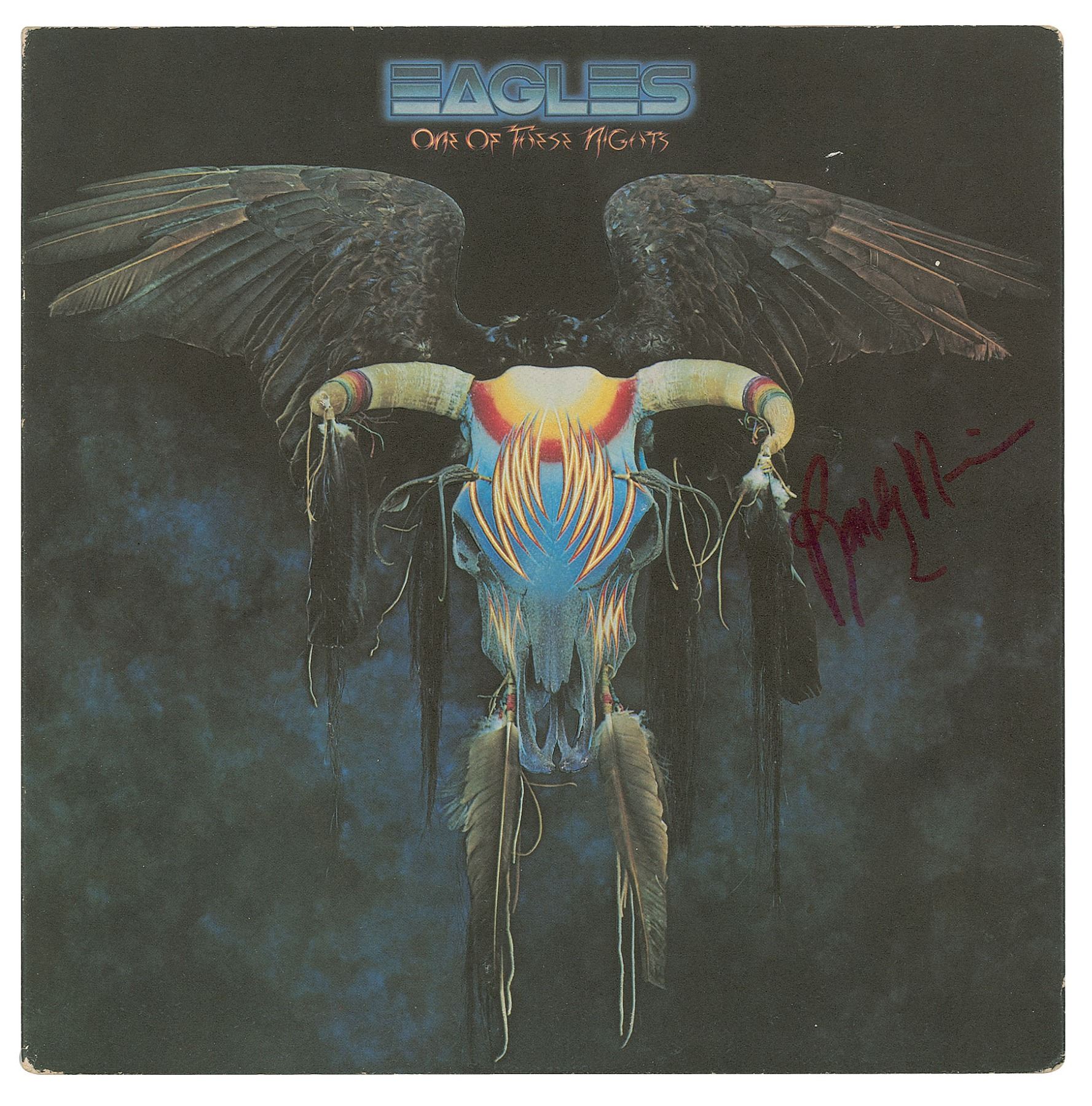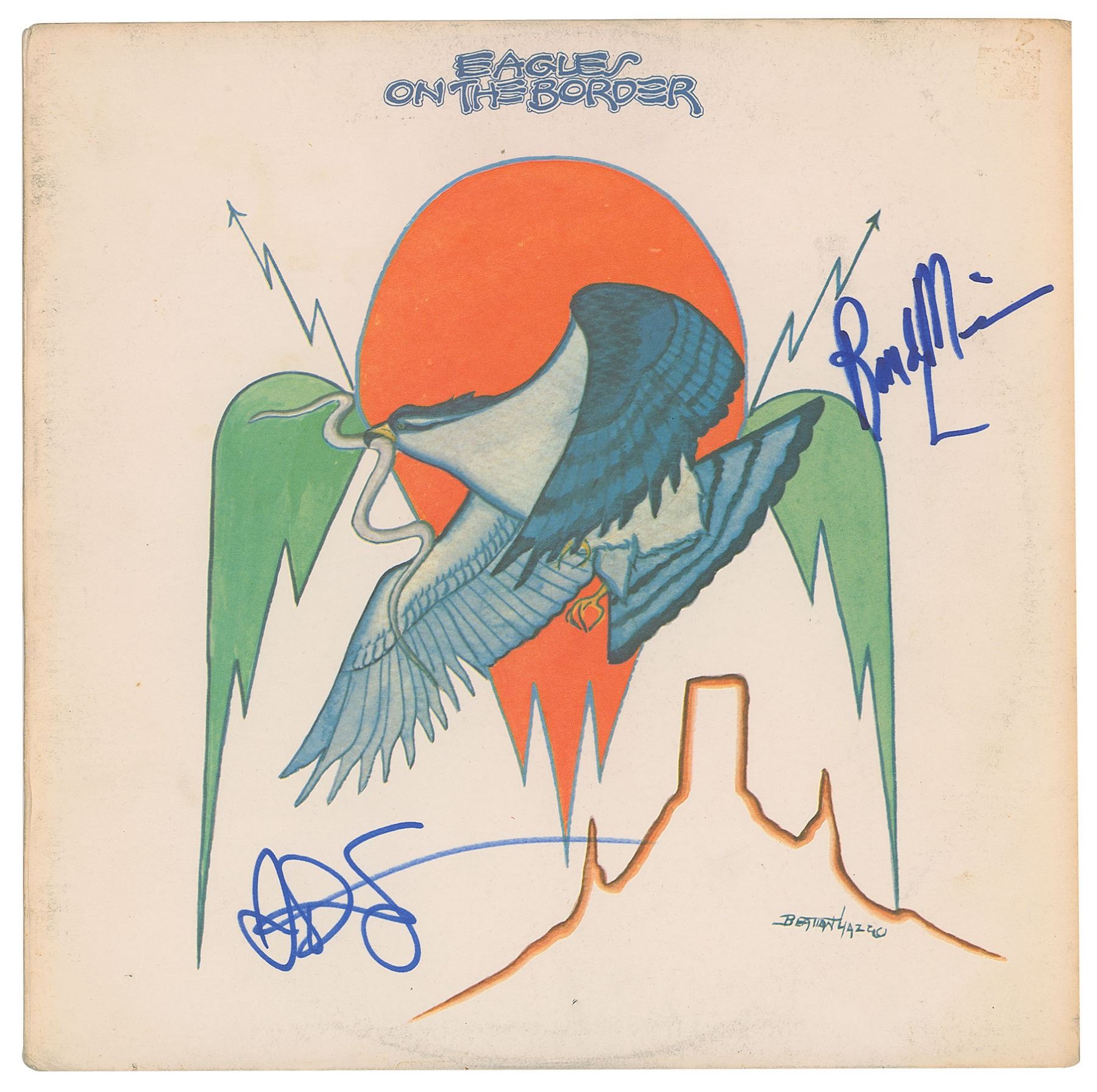 Three albums by the Eagles signed on the front cover in blue felt tip by Randy Meisner—On the Border, One of These Nights, and Eagles: Their Greatest Hits, 1971–1975—with On the Border also signed by J. D. Souther. In overall fine condition, with an affixed price sticker to the Greatest Hits. The records are included.