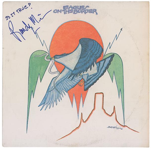 On the Border album signed on the front cover in blue felt tip by Meisner, adding the song title “Is It True?.” In fine condition, with mild ‘ring of wear’ to cover, as well as some scattered light soiling. The record is not included.