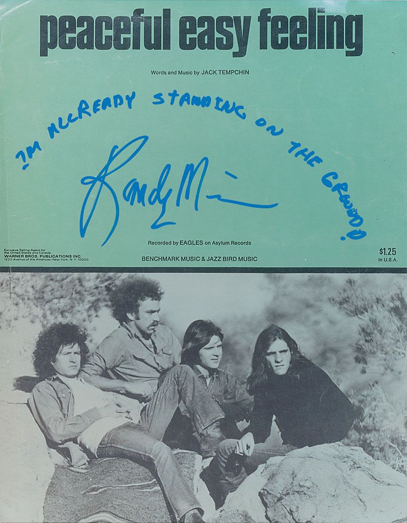 Color glossy 11 x 14 photo of the sheet music to ‘Peaceful Easy Feeling,’ signed in blue ink, “I’m allready standing on the ground! Randy Meisner.” In fine condition.