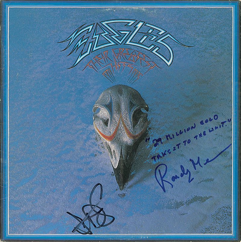 The Eagles Greatest Hits album signed on the front cover in blue felt tip, “29 million sold, Take It to the Limit, Randy Meisner” and also signed in black felt tip by lyricist John David Souther. In fine condition, with some scattered light cover wear and edge creases. The record is not included.