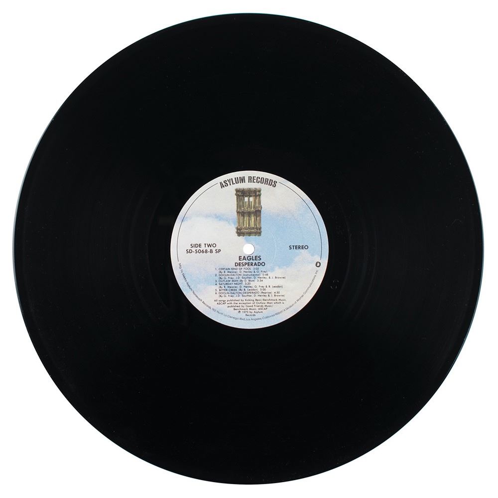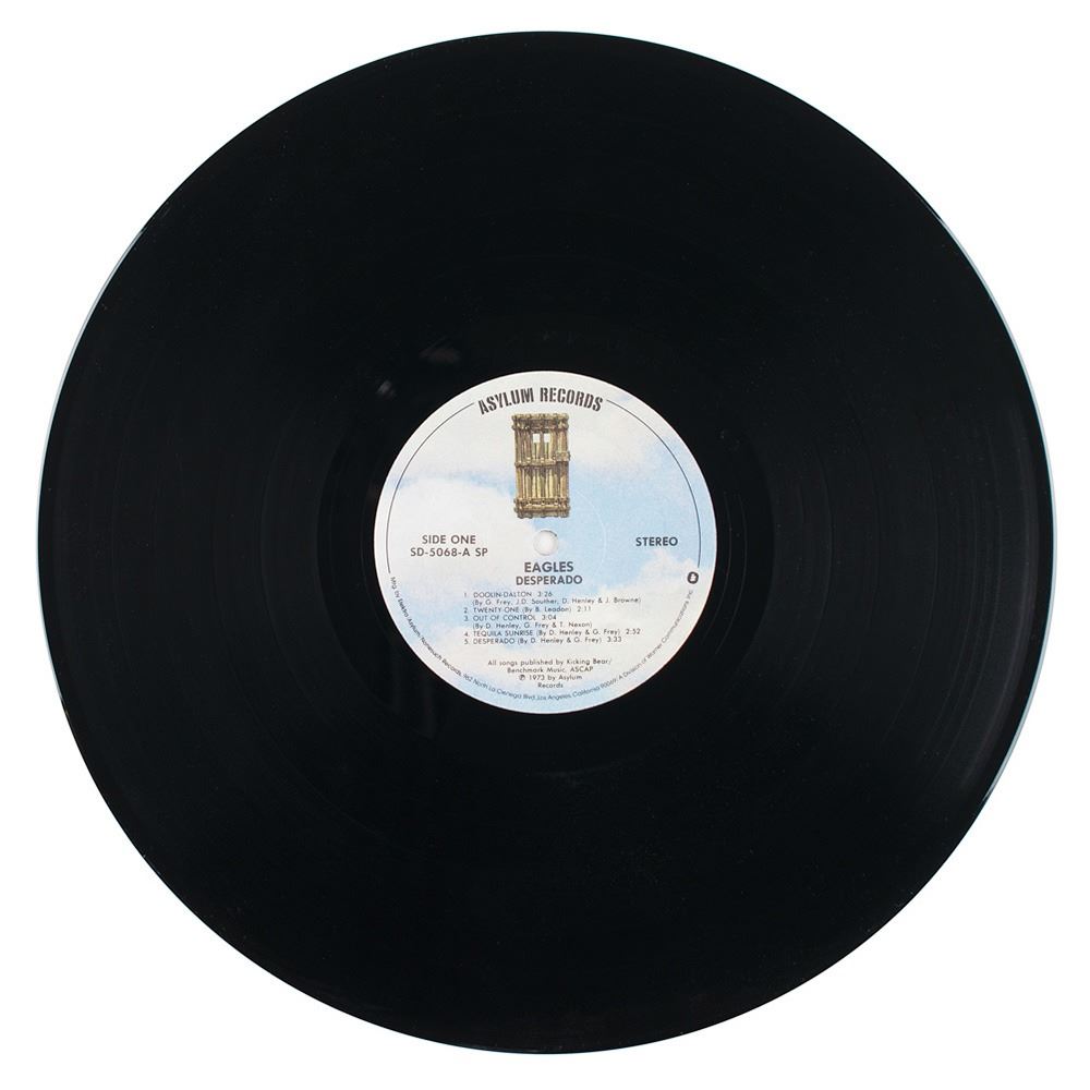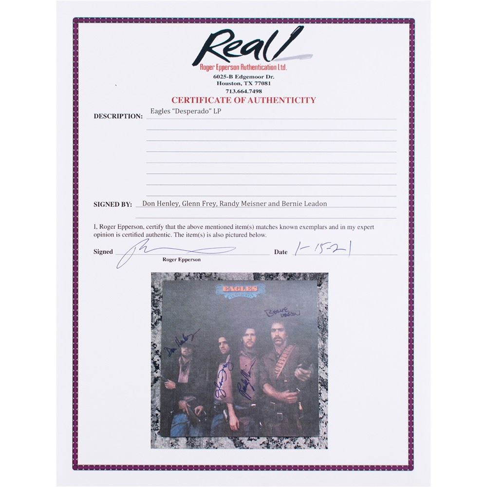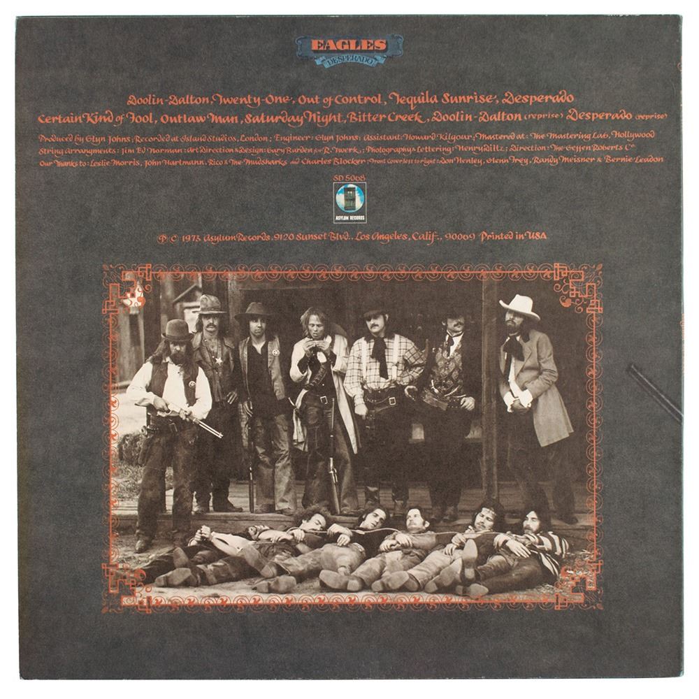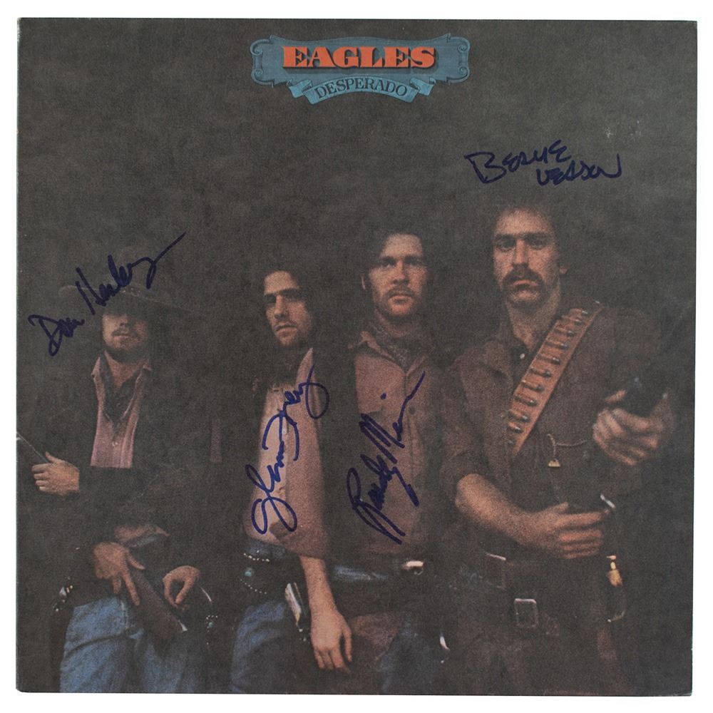 After forming in 1971, the original four-man Eagles line-up would only release two albums: their eponymous debut in 1972 and Desperado, their sophomore follow-up, in 1973. Desperado remains the only Eagles album where the band members appear on the cover, with acclaimed photographer Henry Diltz capturing the memorable cowboy pose at Paramount Ranch in the Santa Monica Mountains. Desperado also contains the first two songs ever written together by Glenn Frey and Don Henley—the classic title track and Tequila Sunrise, both of which were written within the first week of their collaboration. Today, Desperado is critically acclaimed and widely considered one of the Eagles' finest albums. Early and fully signed Eagles albums are highly sought after, with this particular example one of the finest signed Desperado albums we have seen.