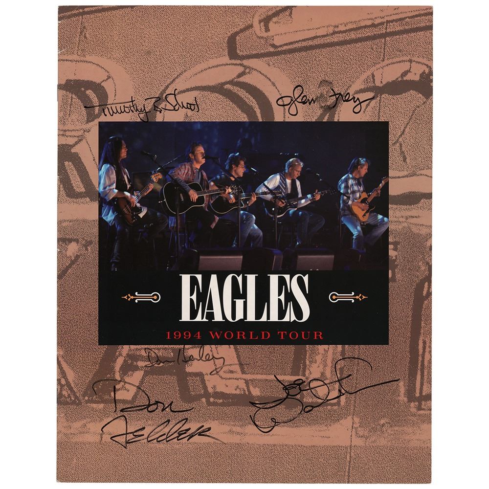 Program for the Eagles' 1994 World Tour, 24 pages, 11 x 14, signed on the front cover in black felt tip by Don Henley, Don Felder, Glenn Frey, Joe Walsh, and Timothy B. Schmit. In fine condition, with creasing to the upper left corner. Accompanied by full letters of authenticity from Perry Cox and REAL.
