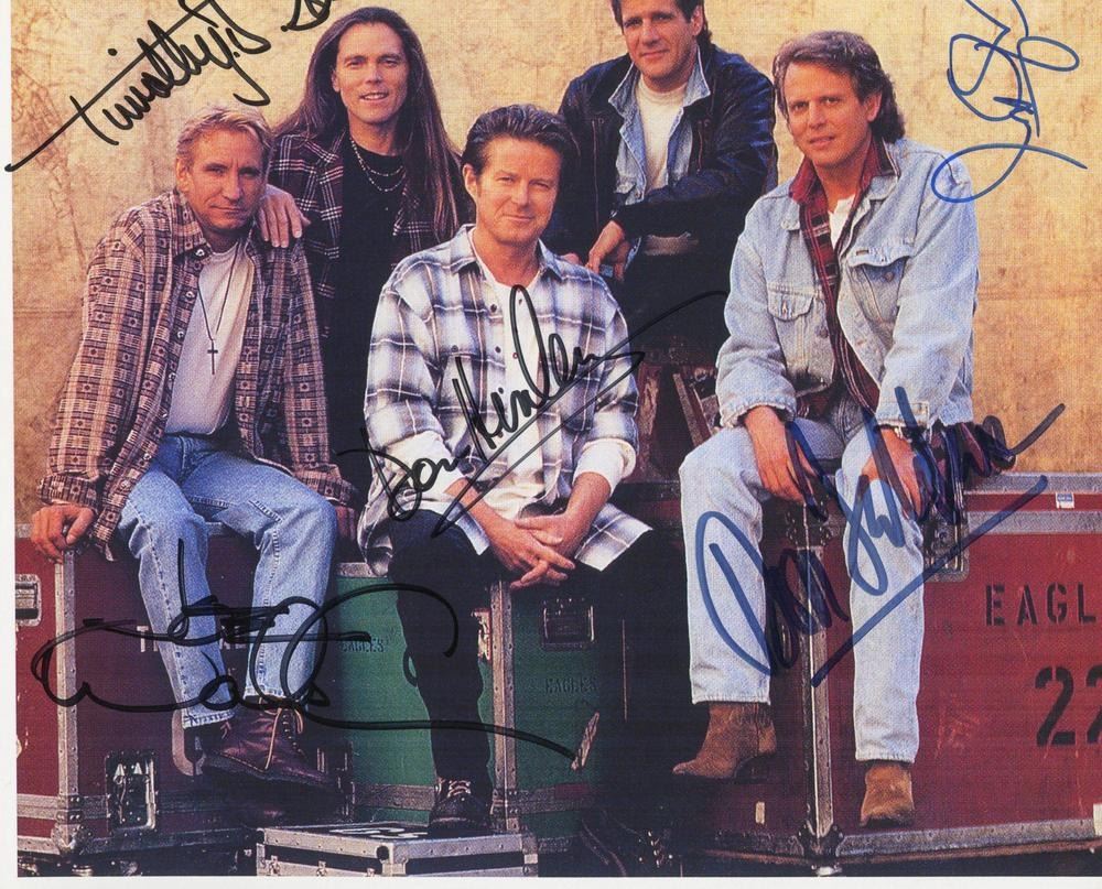 The Eagles signed 8x10 in photo autographed by Don Henley, Glenn Frey, Joe Walsh, Don Felder and Timothy B. Schmit. 8x10 in. This item is a reprint of an original autograph.