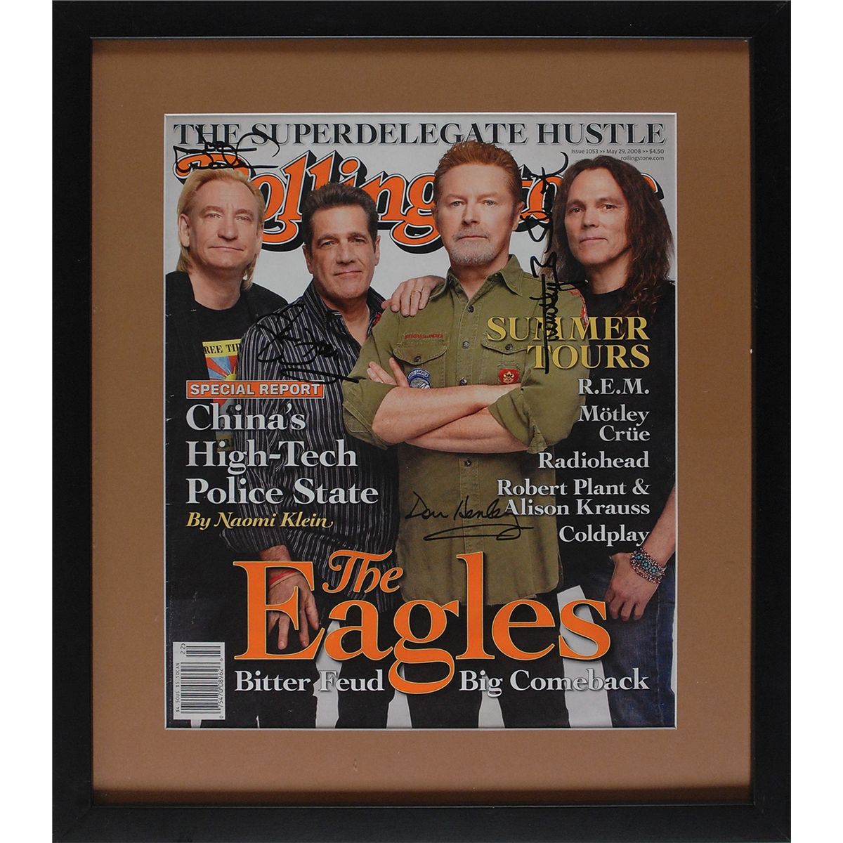 Magazine cover from the May 29, 2008, issue of Rolling Stone, featuring the band, signed in black felt tip by Don Henley, Glenn Frey, Joe Walsh, and Timothy B. Schmit. Matted and framed to an overall size of 14.25 x 16.25. In fine condition. Accompanied by a full letter of authenticity from Roger Epperson/REAL.